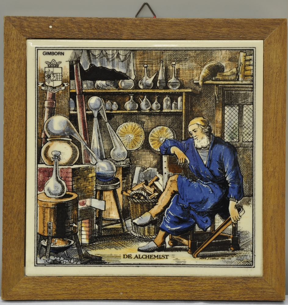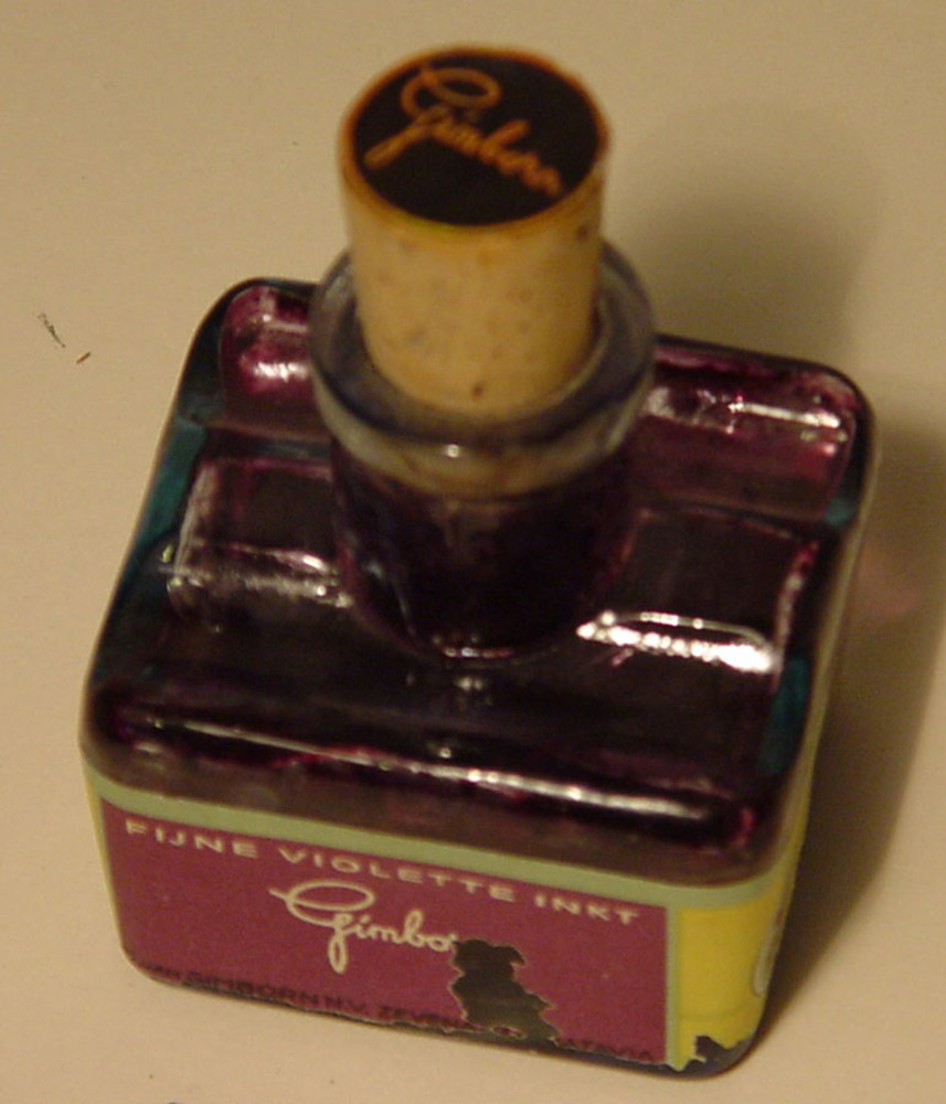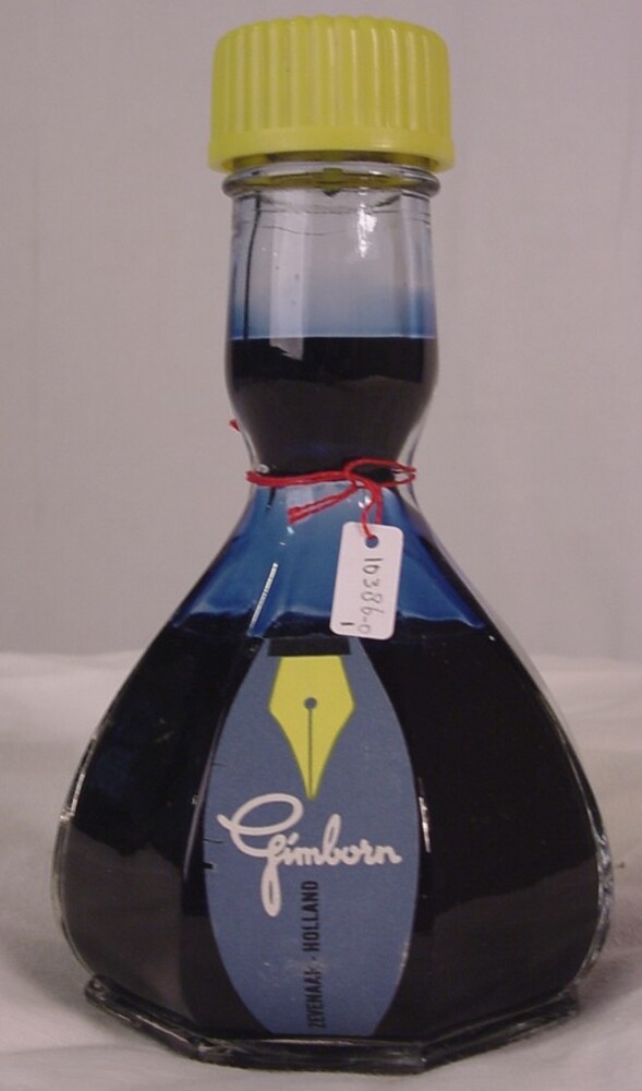 Inktflesje van glas gevuld met inkt van H. van Gimbo...