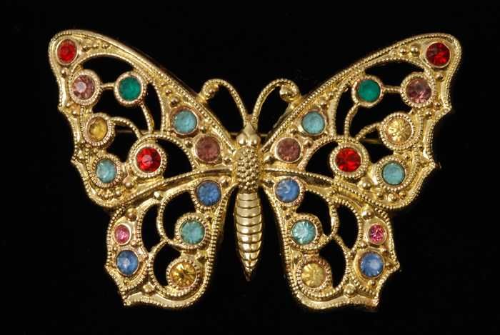 Broche, vlinder van goudkleurig filigrein metaal met...