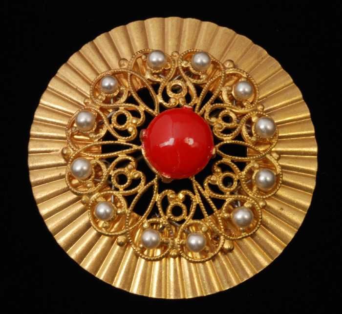 Ronde broche, goudkleurig metaal met filigrein waaro...