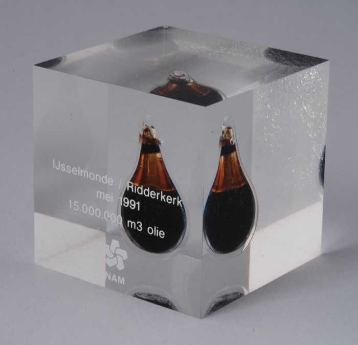 Presse-papier, perspex kubus met druppel aardolie