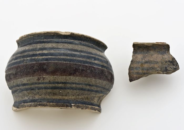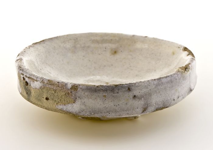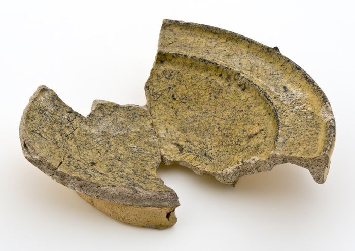 Fragment klein aardewerk bord of zoutschaal, grijze ...