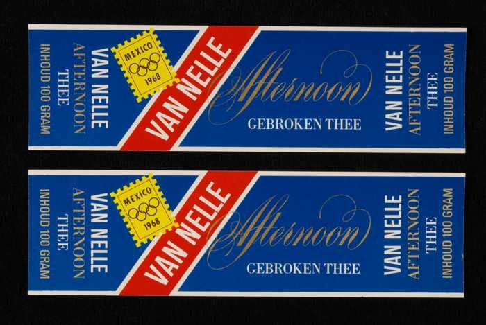 Twee blauwe, papieren labels VAN NELLE AFTERNOON THE...