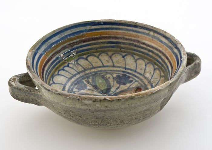 Fragmenten van majolica zalfpot met polychroom decor...
