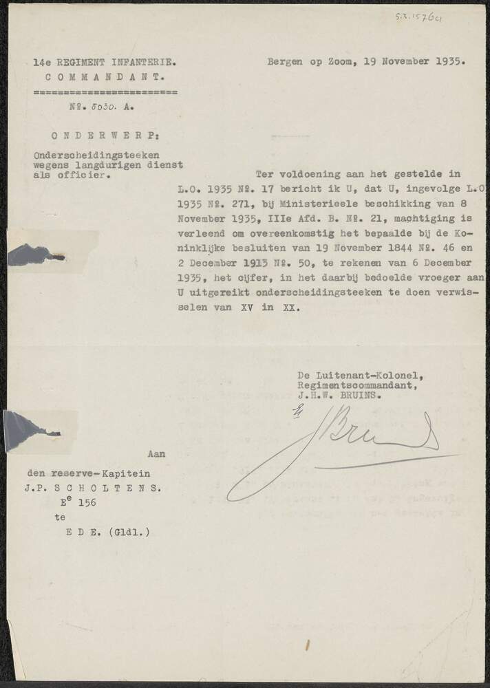 Brief van commandant 14de Regiment Infanterie aan J....