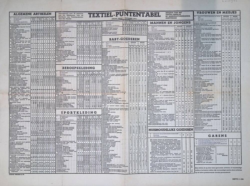 Textiel-puntentabel, 1 november 1941