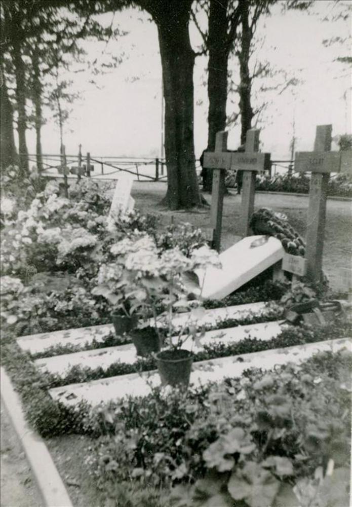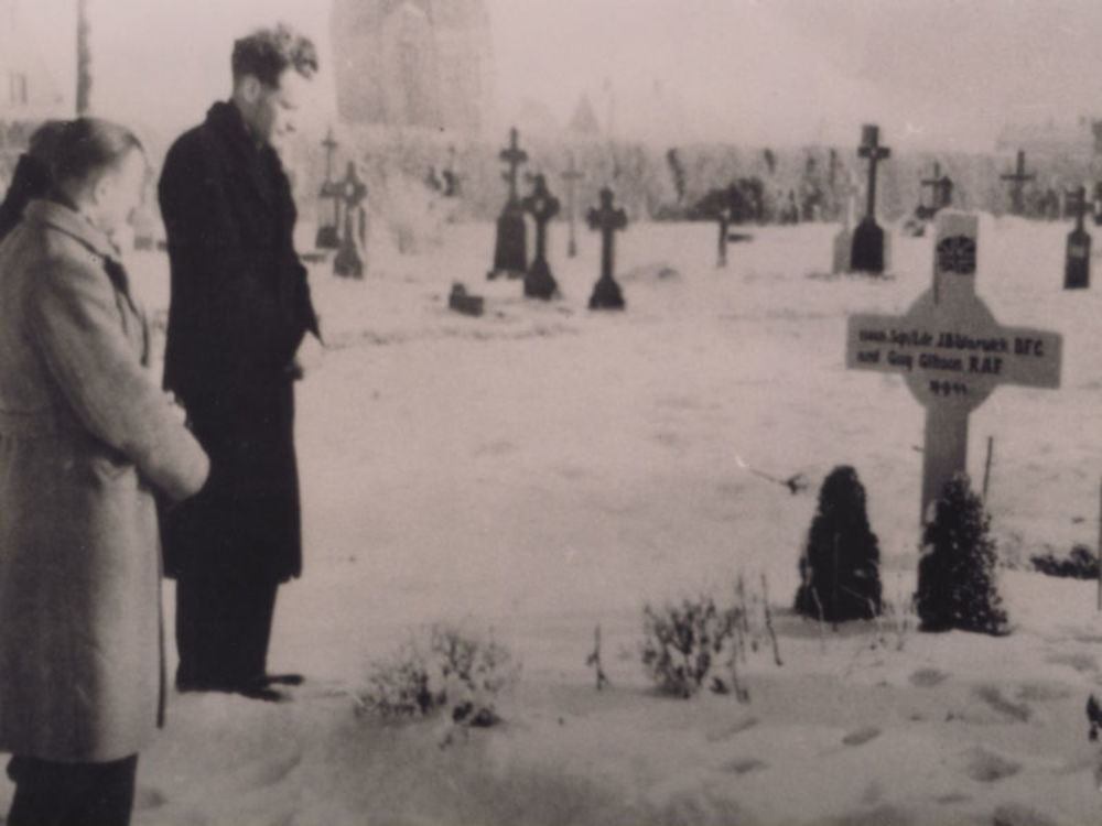 Foto man en vrouw bij graf twee Britse vliegers in d...