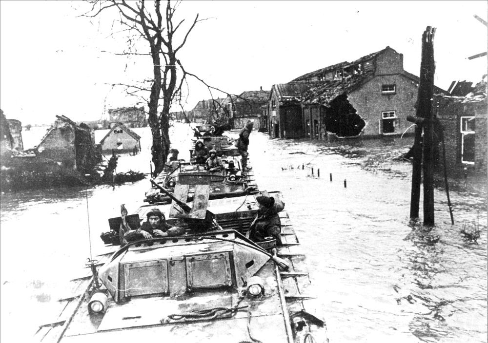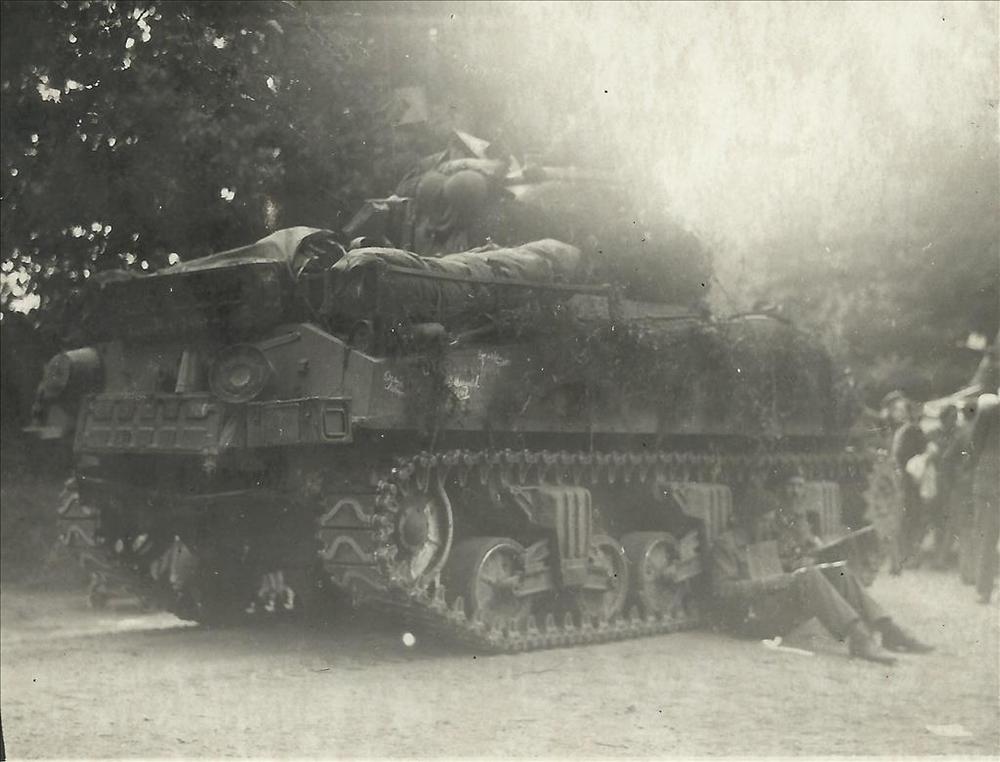Soldaat op Duitse tank die in greppel is vastgereden