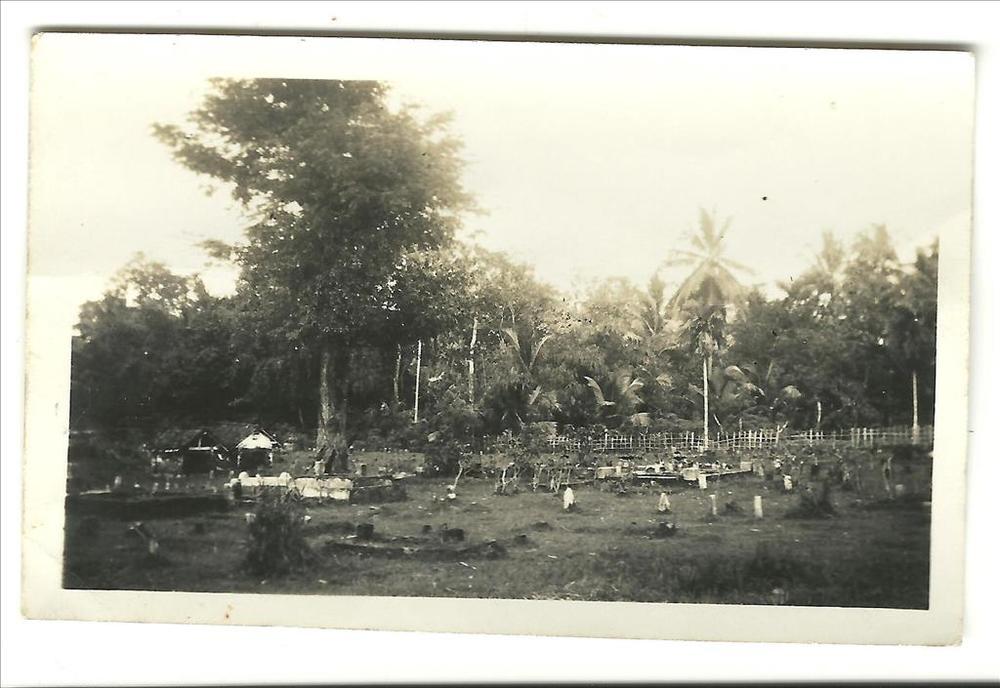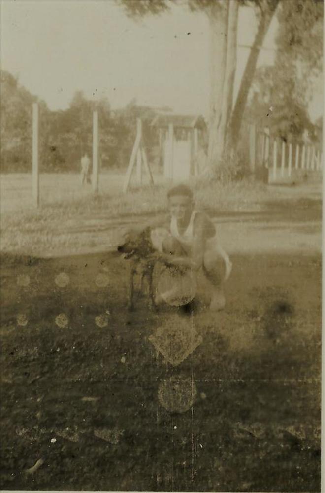 Nederlands Indië; hek, bomen, man in singlet, hond
