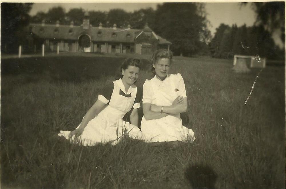 twee verpleegsters, gras, Stallen Chalet Brakkestein...