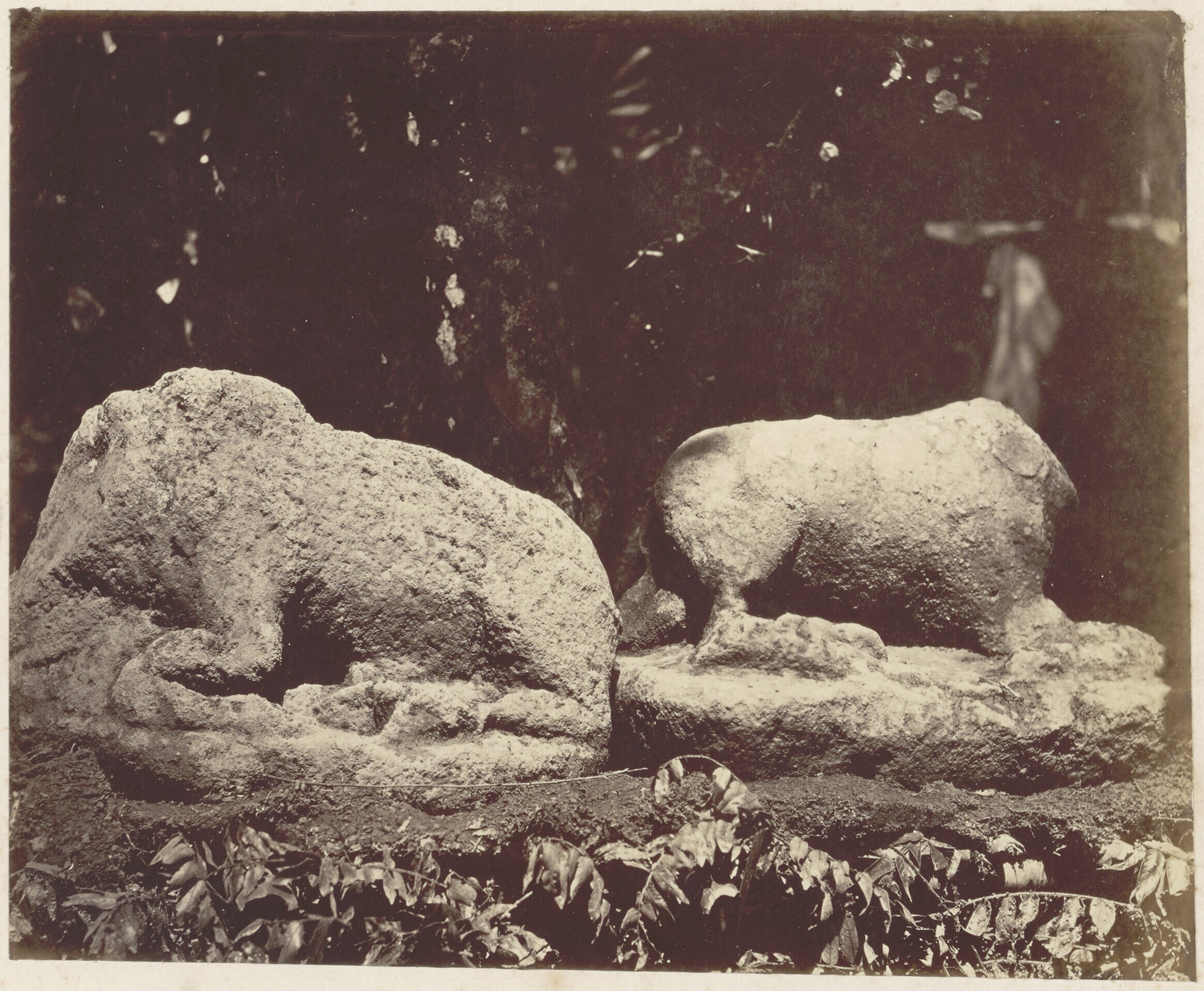 Een foto van twee stenen beelden (Nandi's) in Tjoepo...