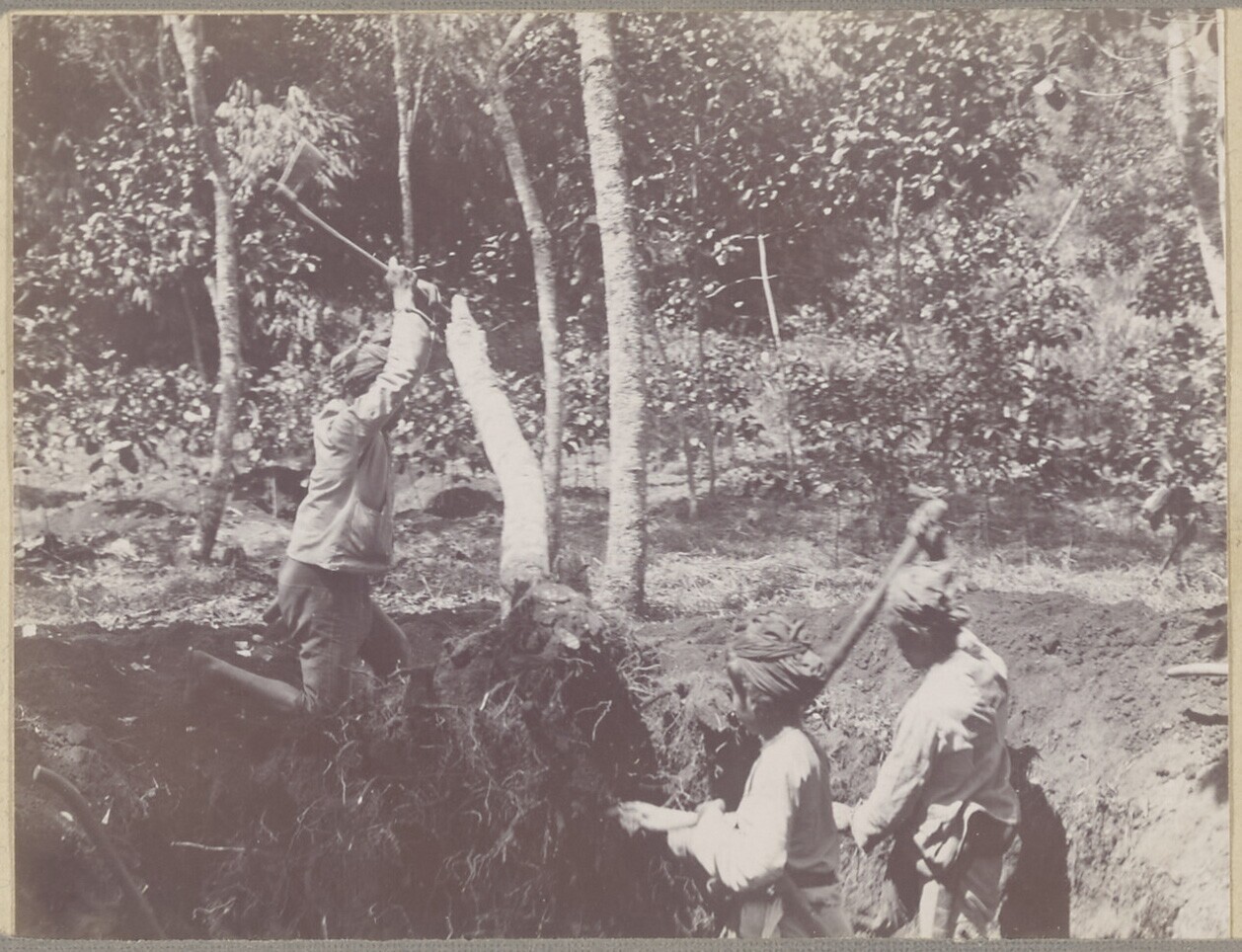 Javaanse arbeiders bezig met het rooien van bomen