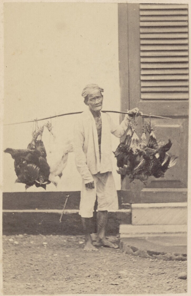 Javaanse straatventer met stok beladen met gevolgte ...