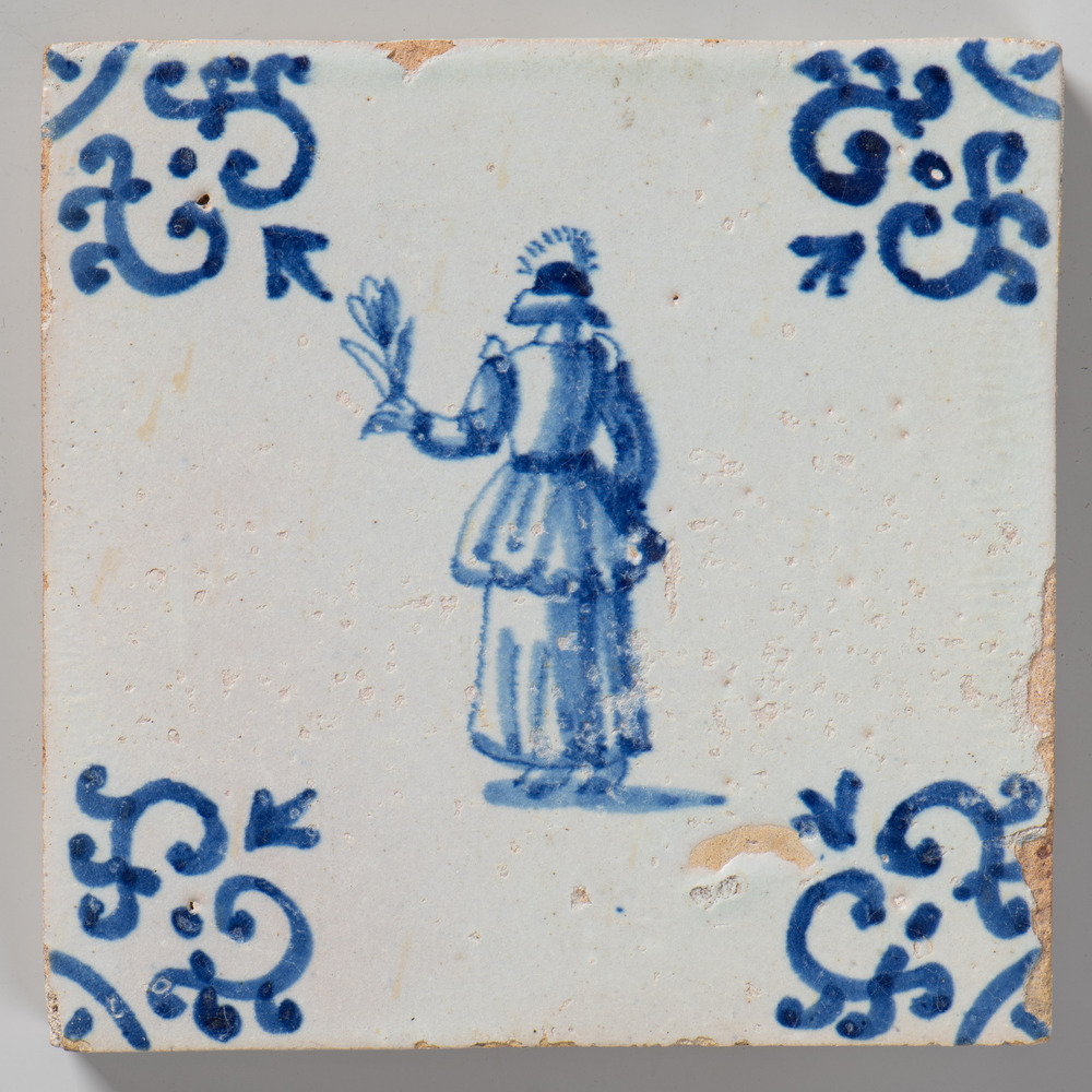 Tegel van aardewerk met tinglazuur, voorstellende: V...