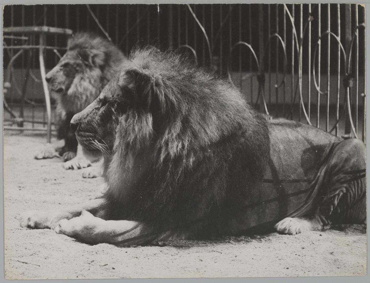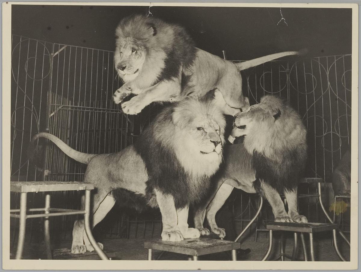 Staatscircus van Moskou. 4 leeuwen als ruiters, gepr...