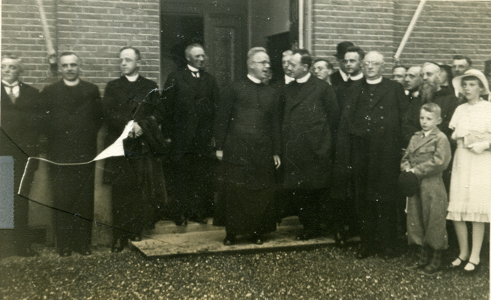 Zwart-wit foto van het inhalen van pastoor Terwissch...