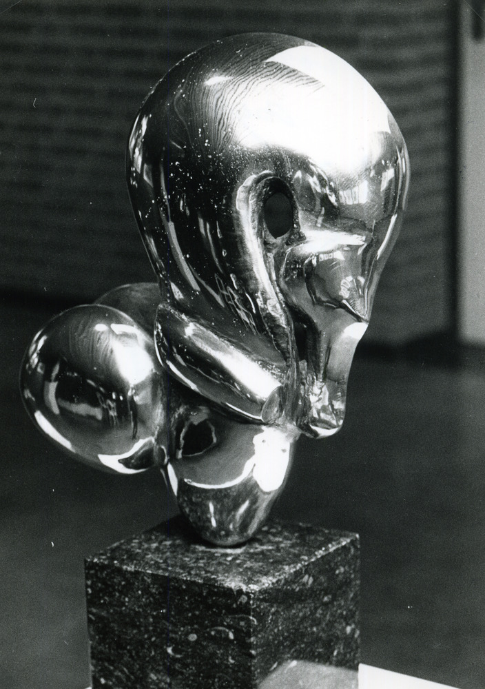 Zwart-wit foto van een kunstwerk tijdens een exposit...