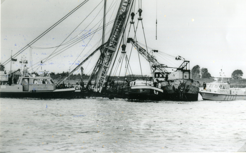 Zwart-wit foto van de berging van een schip in de na...