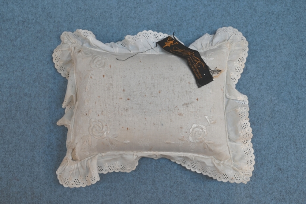 Speldenkussen van textiel wit en opgeborgen in een d...