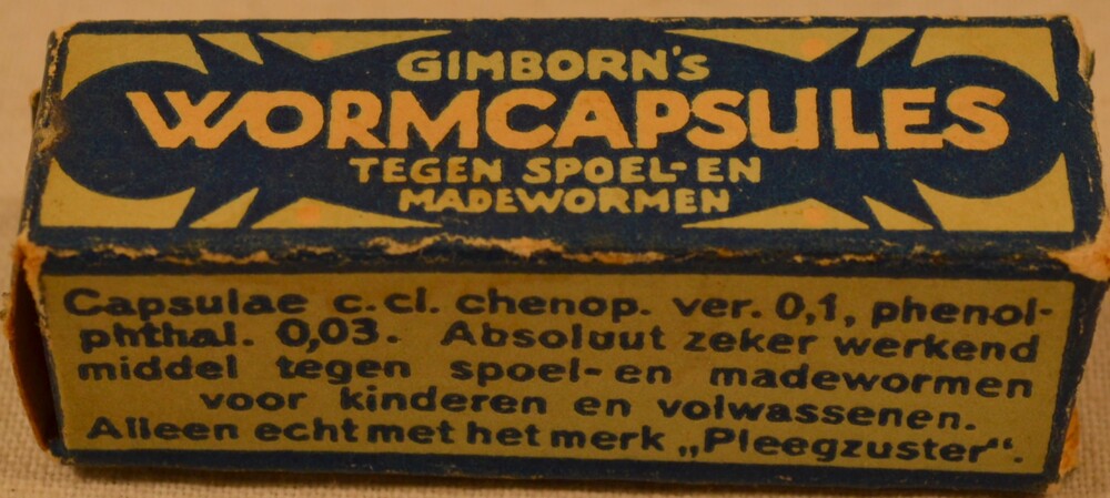 Een doosje van karton gevuld met medicijnen wormcaps...
