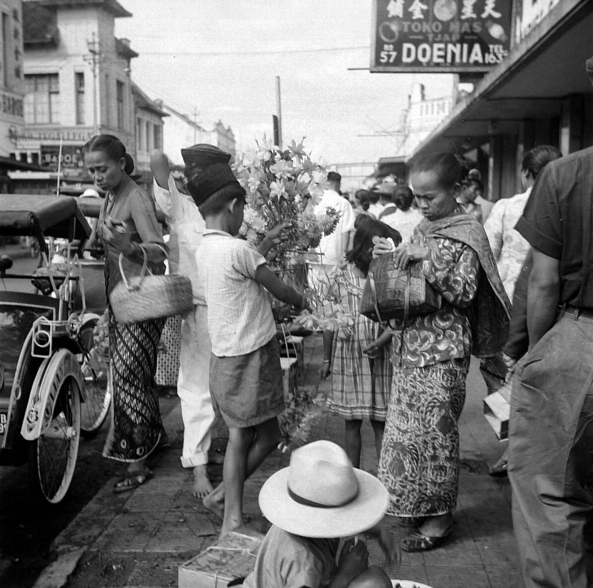 De verkoop van kunstbloemen op de markt te Bandung, ...