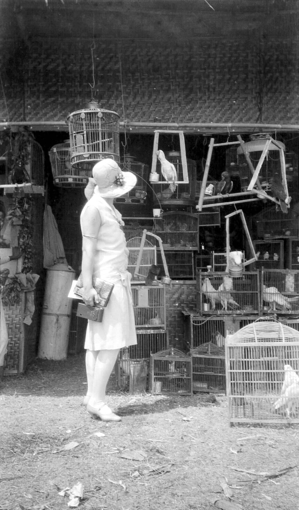 Een Europese vrouw bekijkt een vogelwinkel in Jakart...