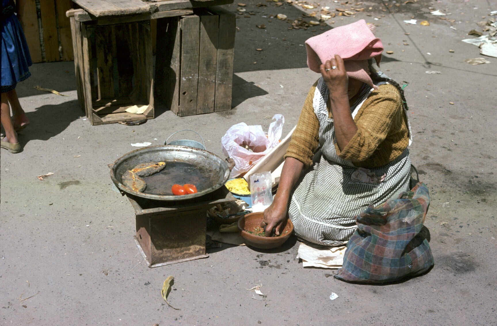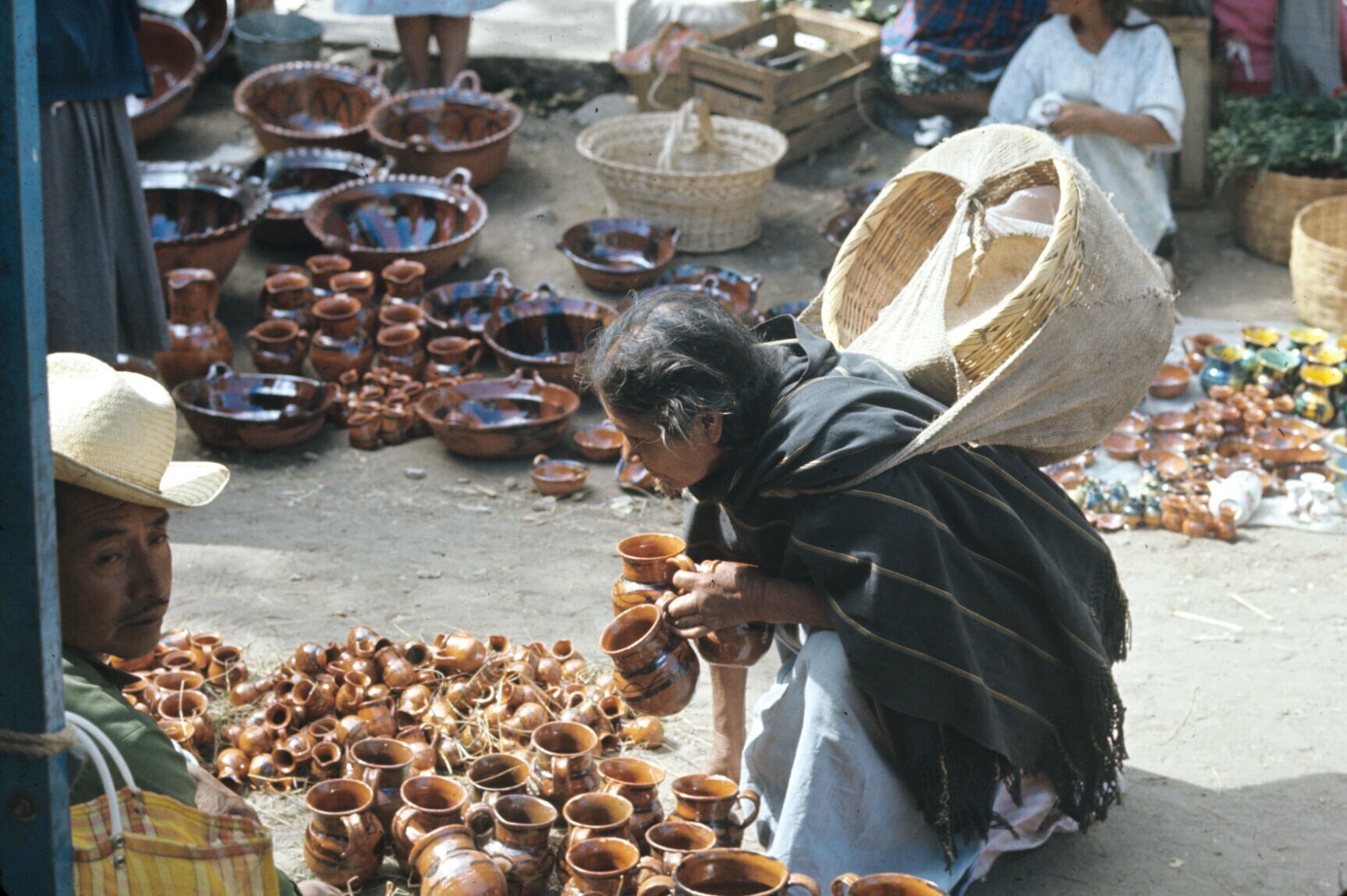 vrouw, aardewerk kopend op markt