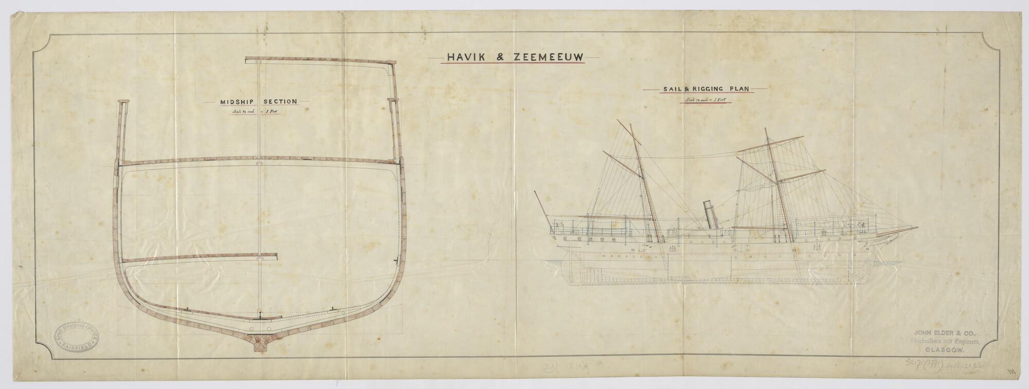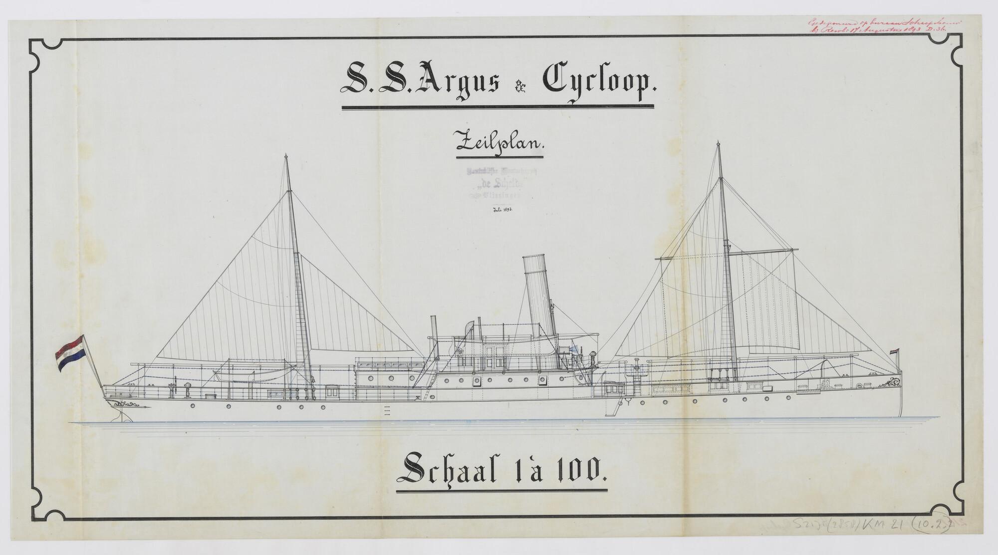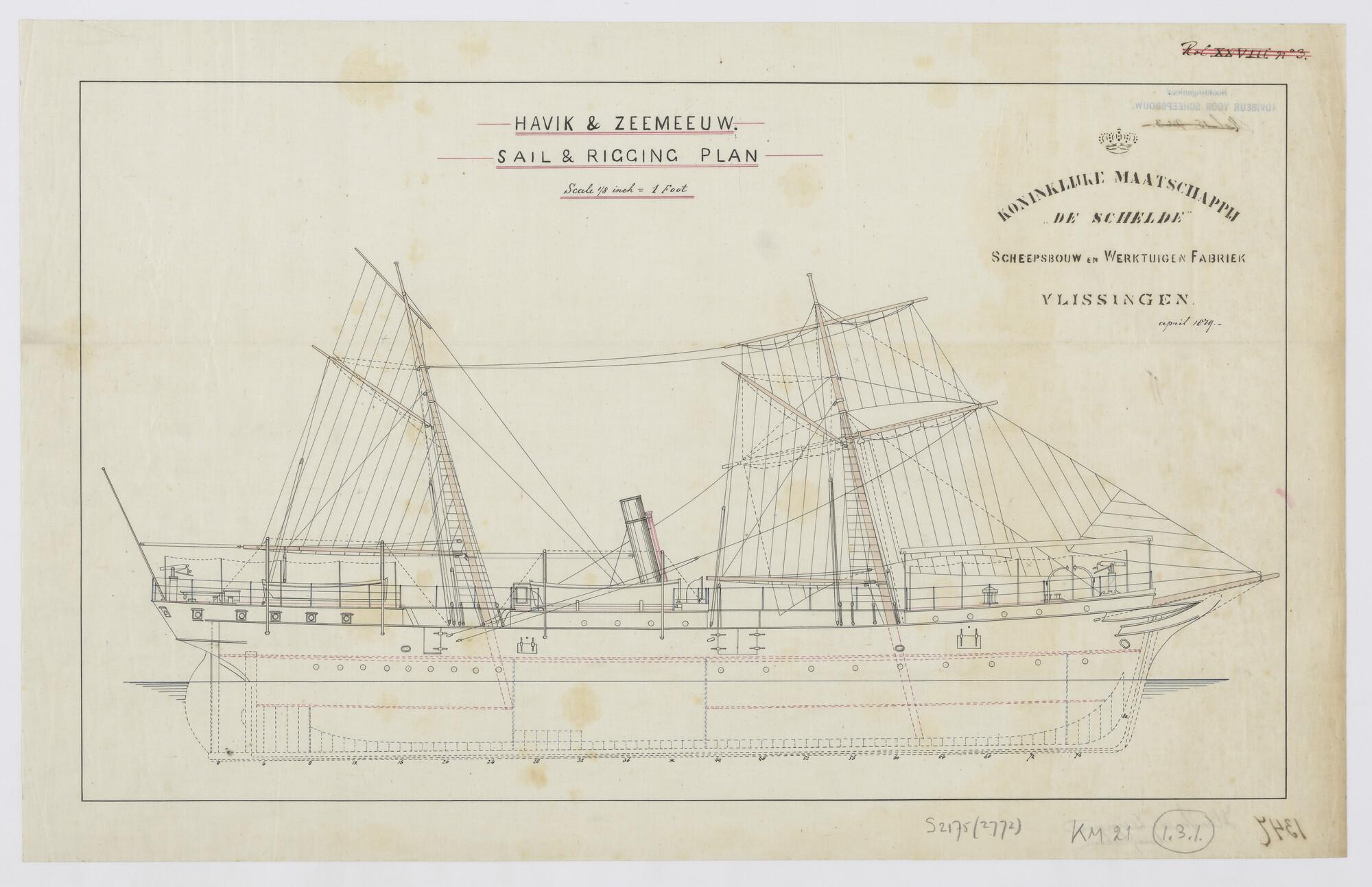 Zeilplan en tuigtekening van het schroefstoomschip v...