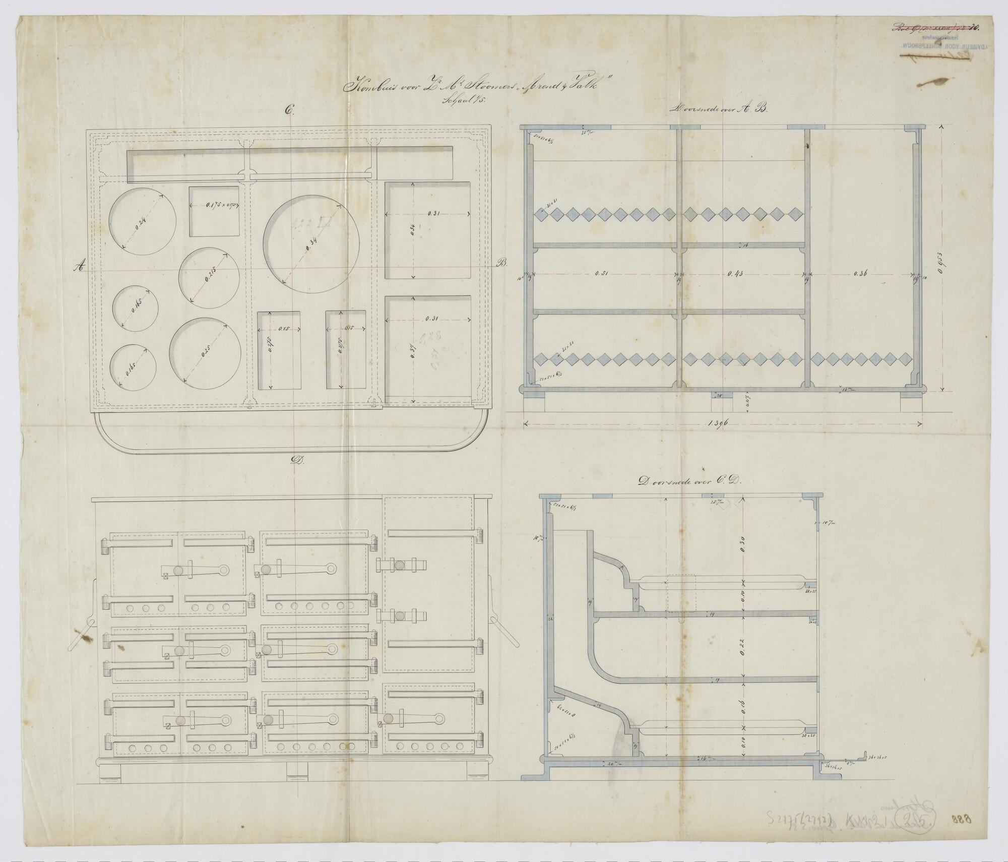 Verticale- en horizontale langsdoorsnede van de schr...