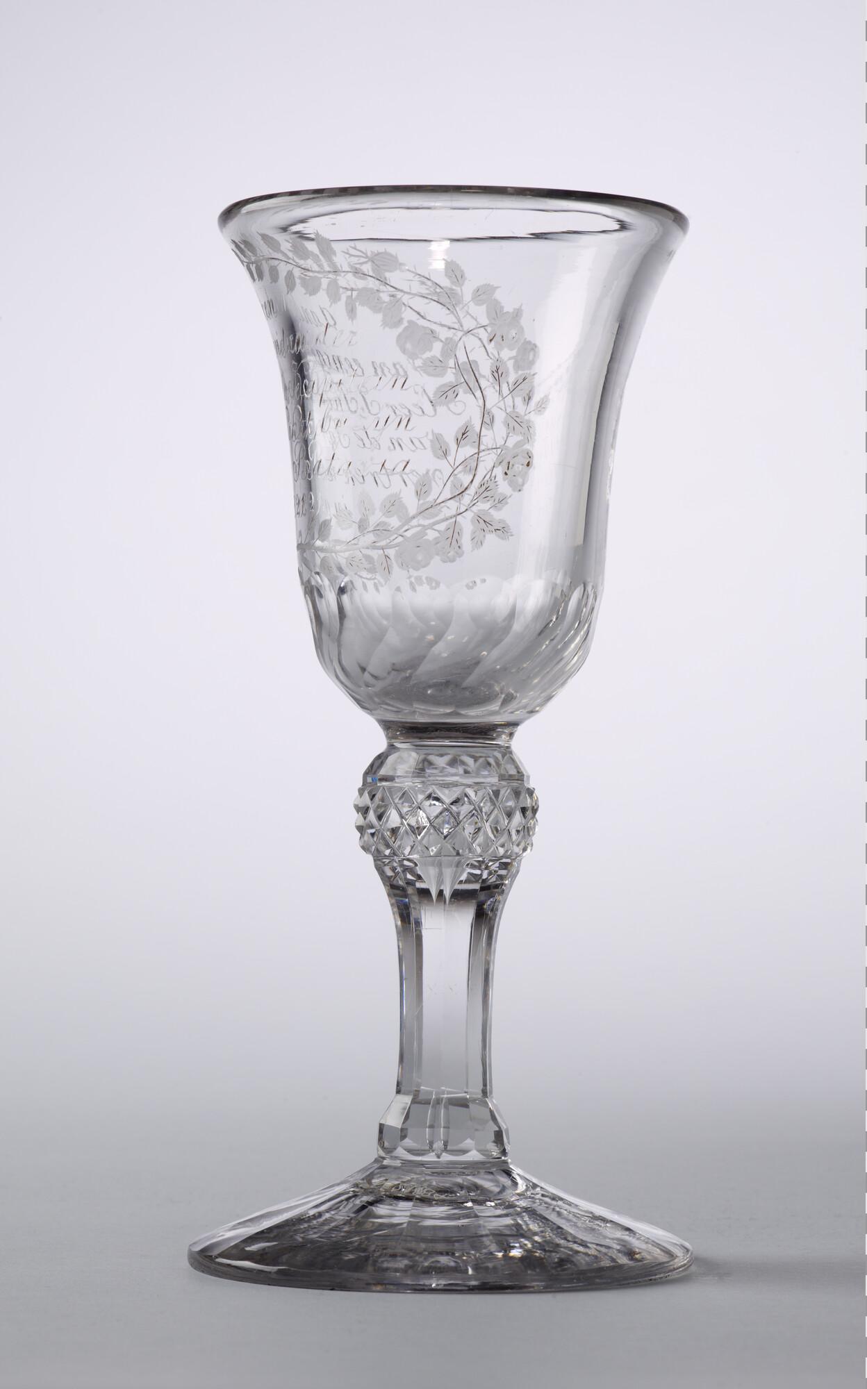 Boheems wijnglas met een radgravure van rozentakken ...