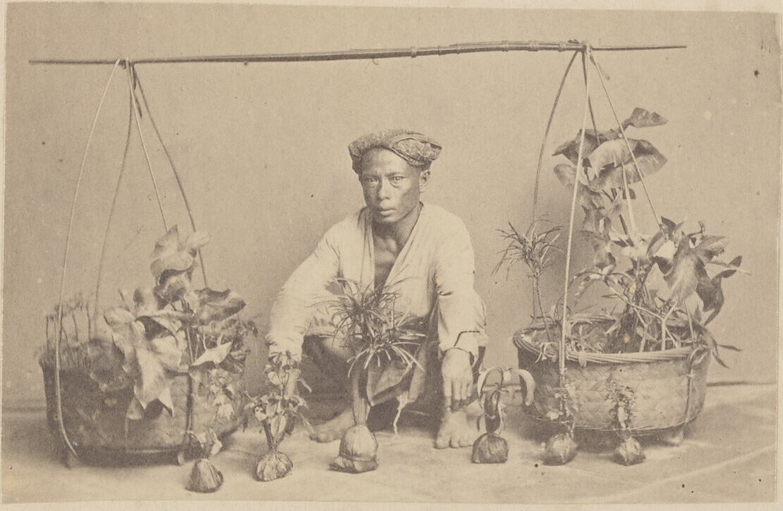 Javaanse verkoper van planten zittend bij zijn hande...