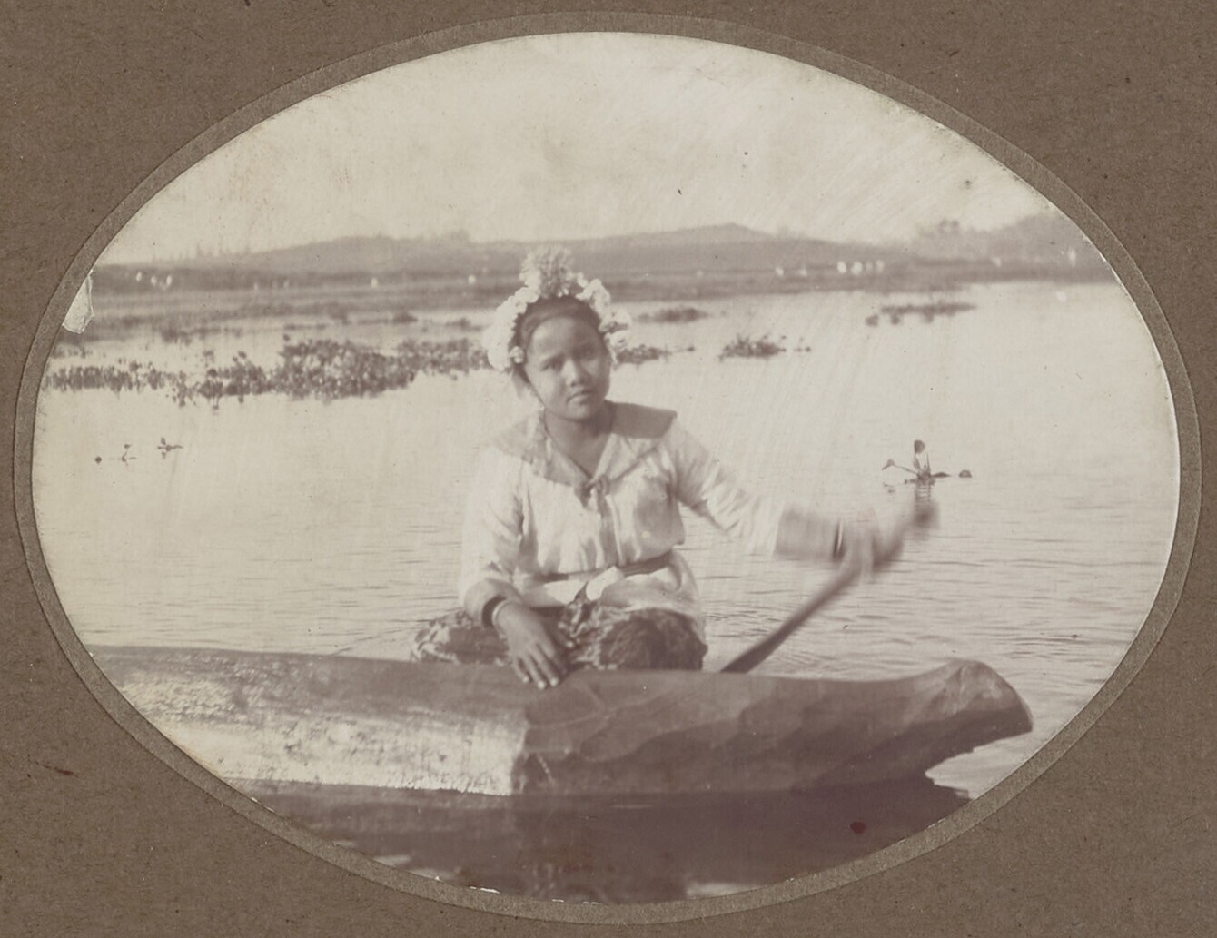 Javaanse vrouw met bloemenhoofdtooi in een boomstamk...