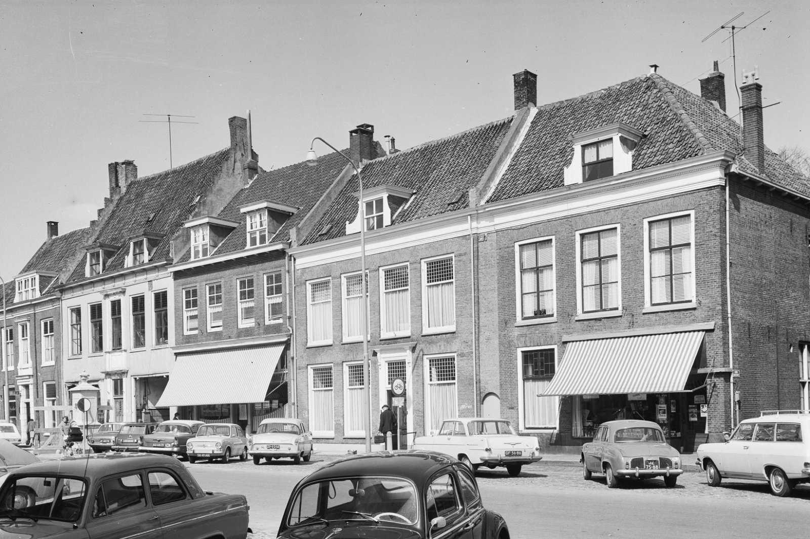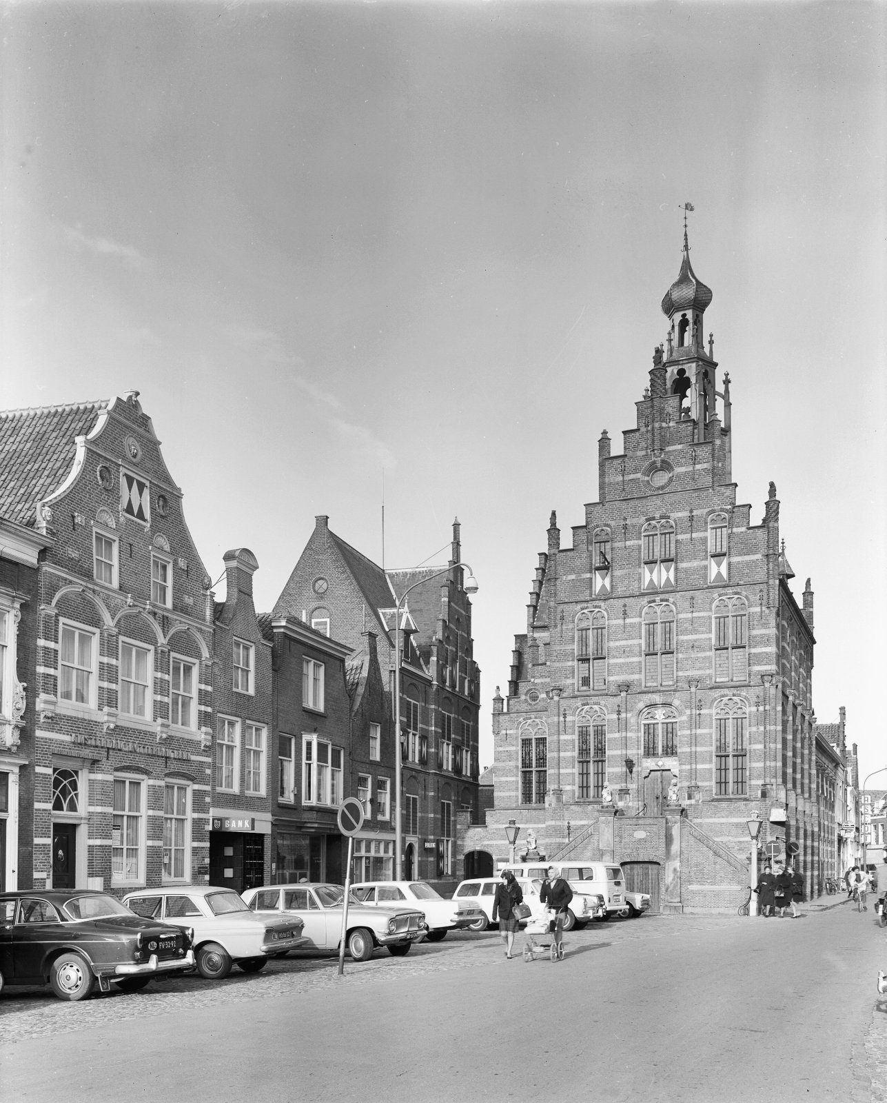 Overzicht Markt met woonhuizen, stadhuis en spits va...