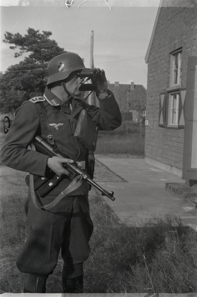 Een Luftwaffe Oberfeldwebel met verrekijker en MP 38...