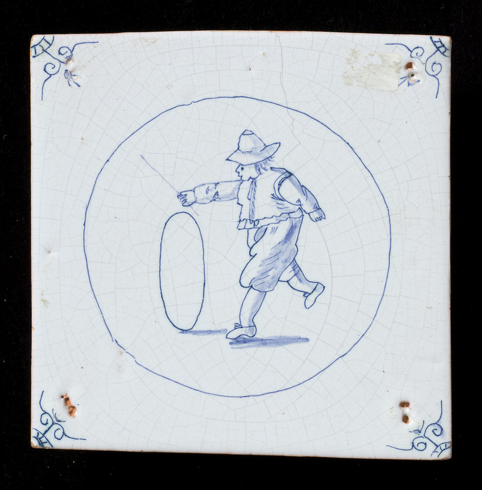 Tegel in tinglazuur, voorstellende hoepelen, vervaar...