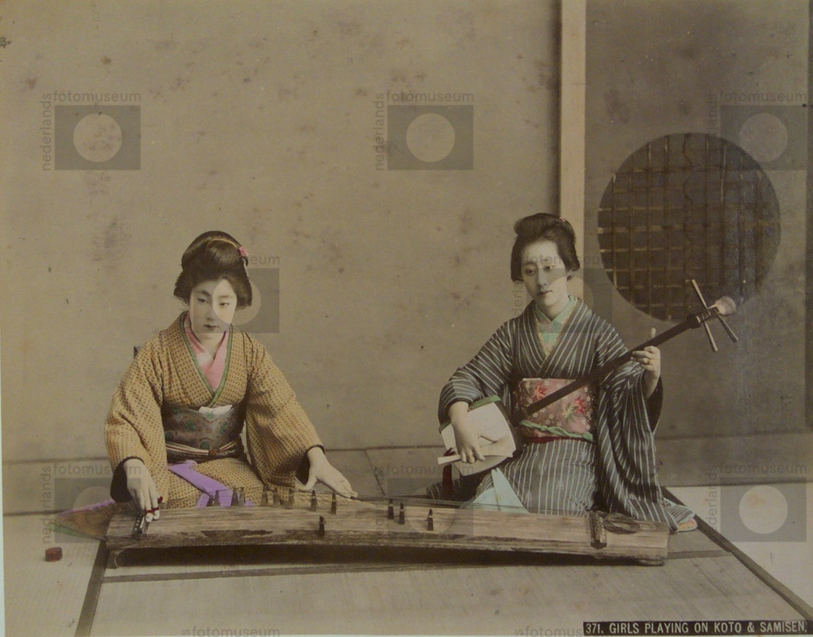 Geisha's bespelen een koto en samisen, Japanse s...