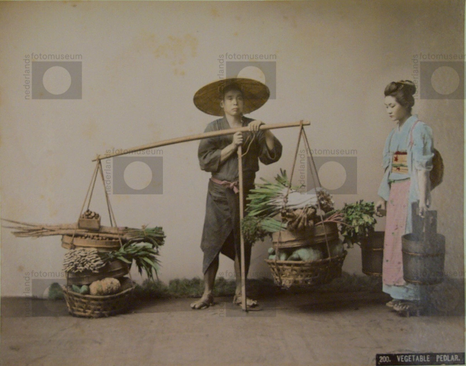Studioportret van een groenteverkoper en dienstmeisj...