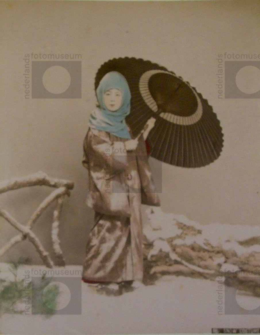 Winterscene, vrouw in de sneeuw met parasol, Japan (...