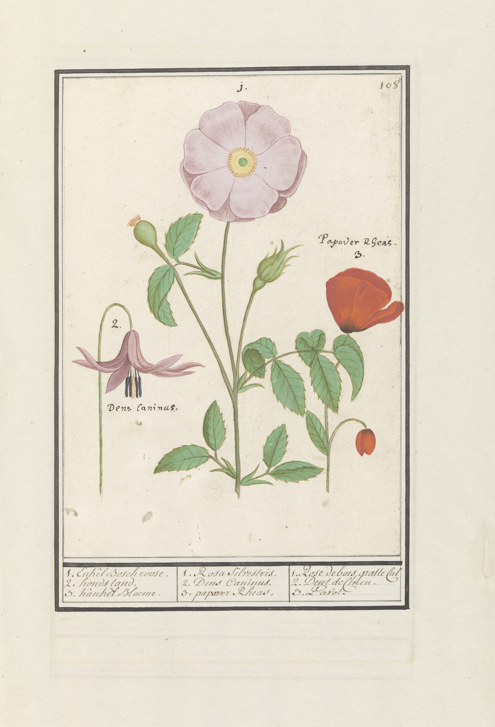 Hondstand (Erythronium), wilde roos (Rosa) en een kl...