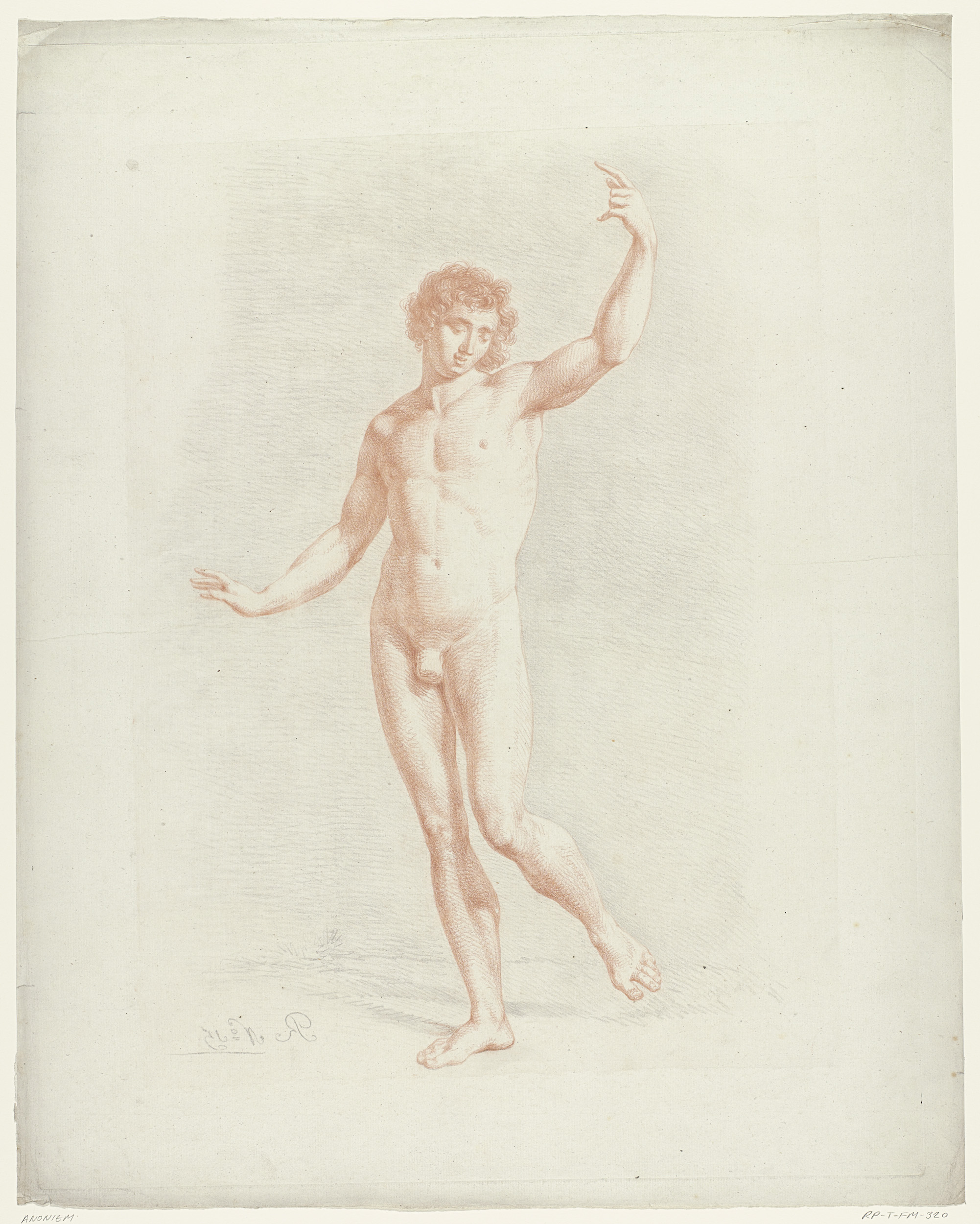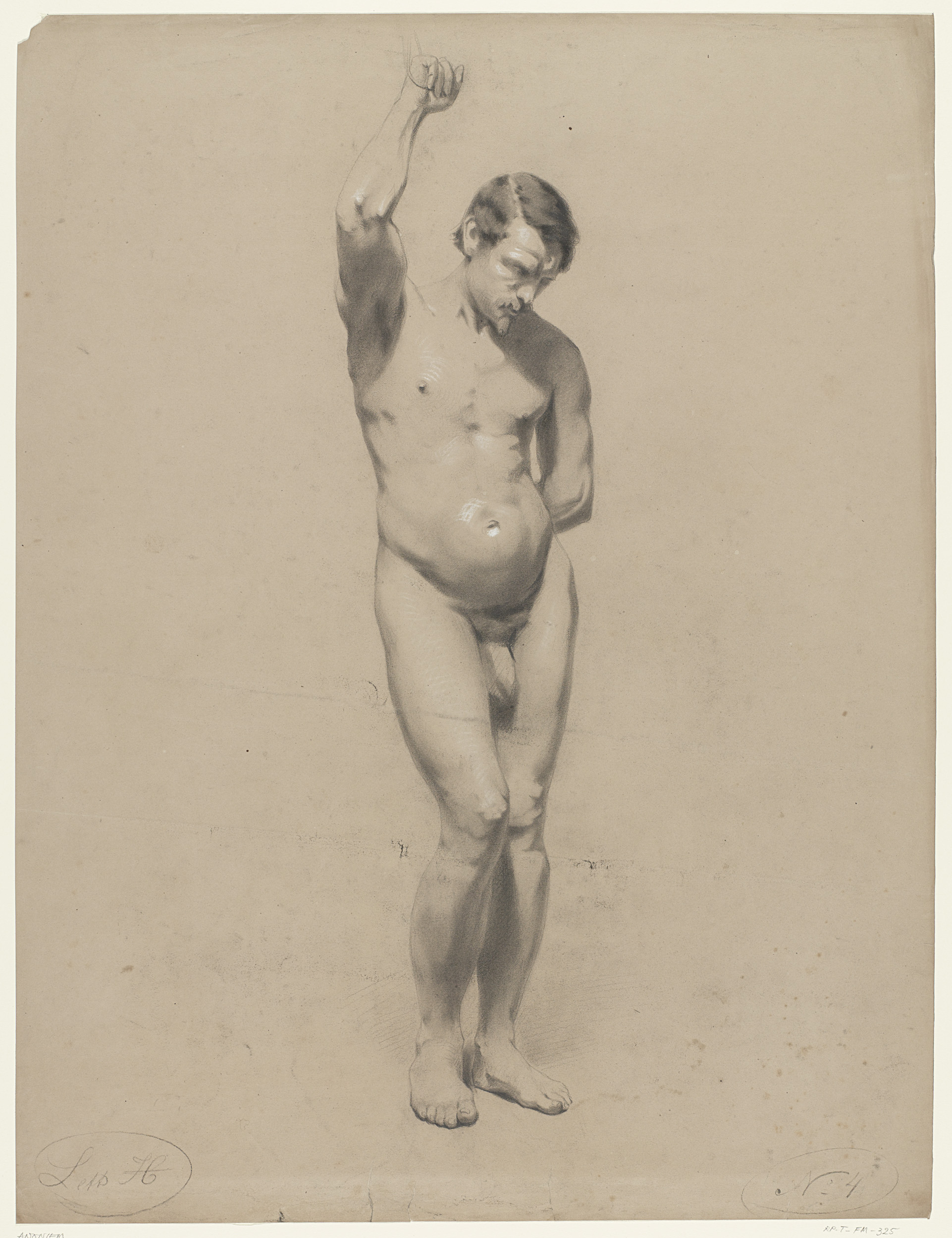 Staand mannelijk naakt, een arm opgeheven en de ande...