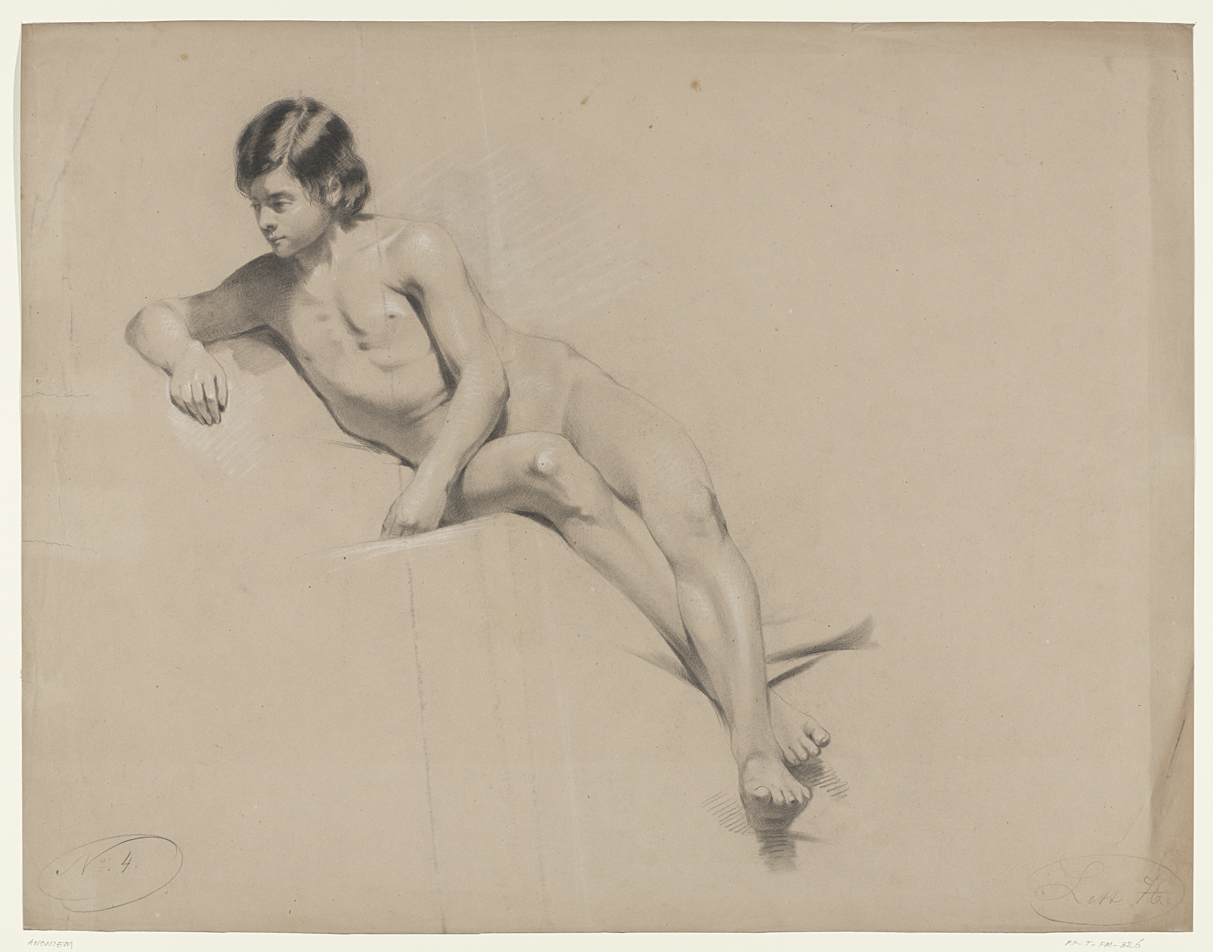 Zittende naakte jongen, naar links geleund