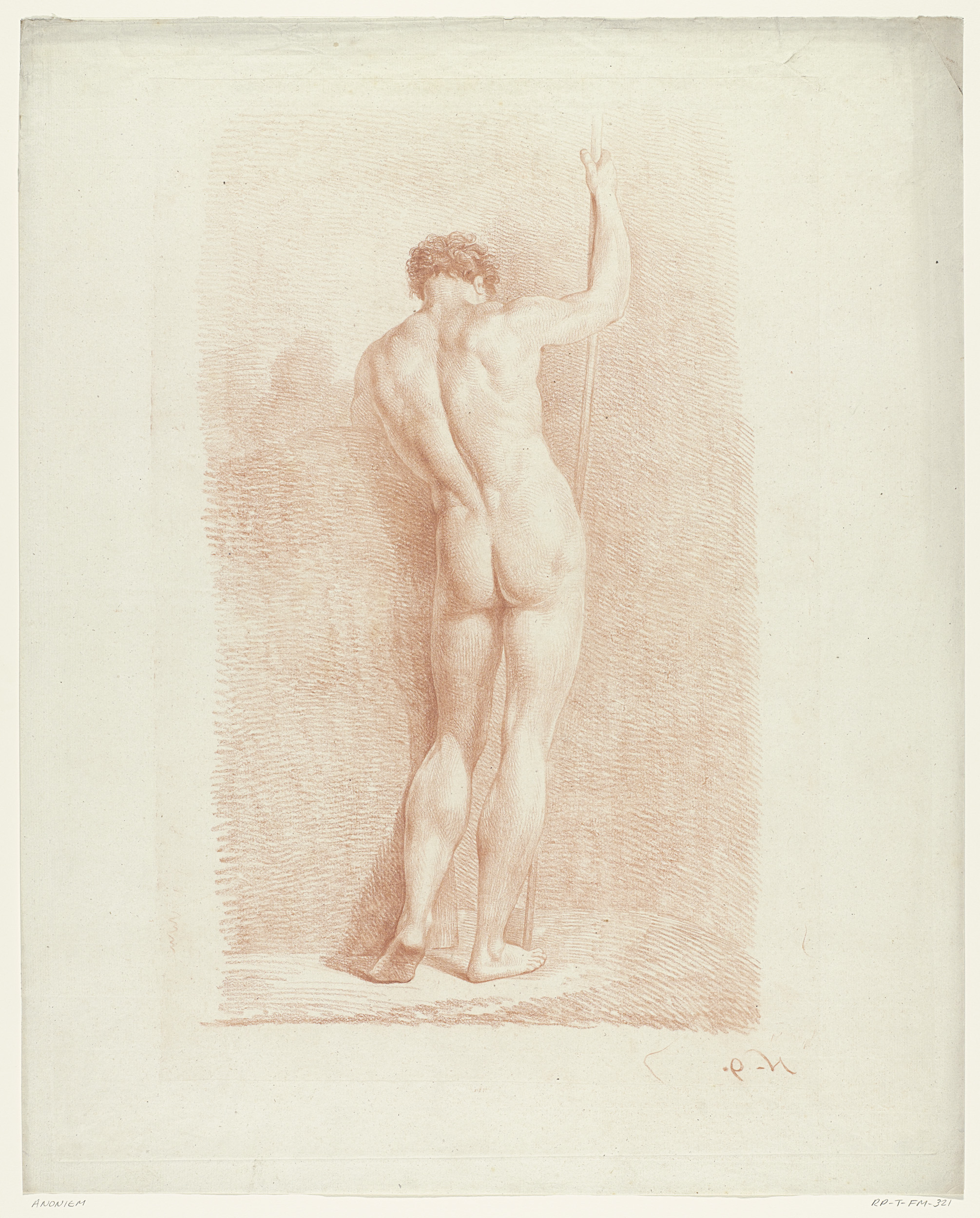 Staand mannelijk naakt met opgeheven arm, van achter...