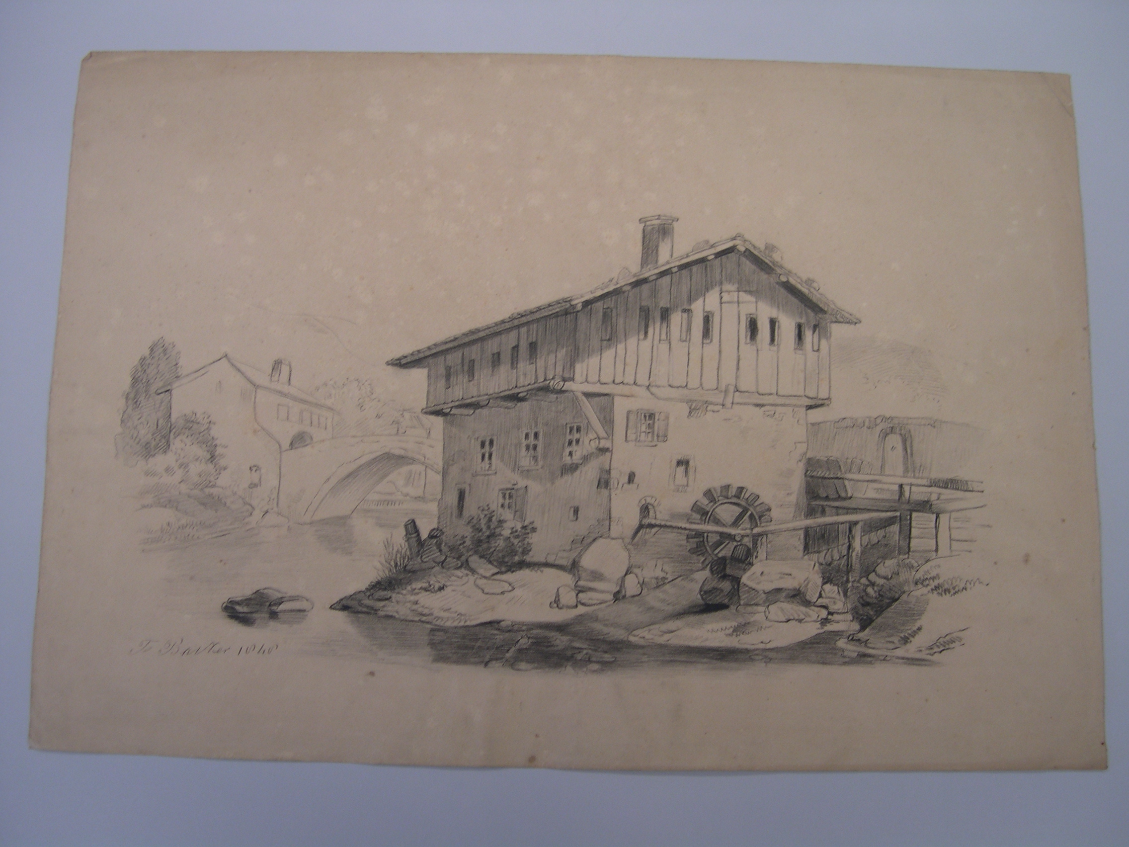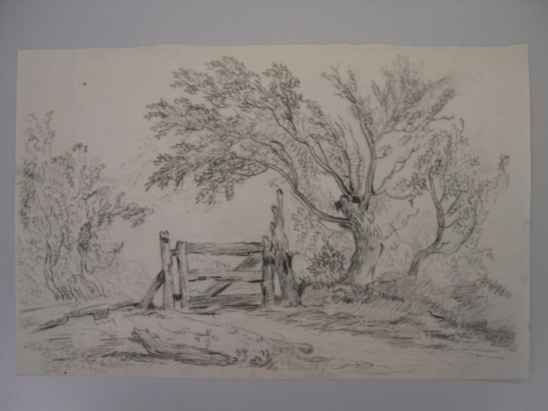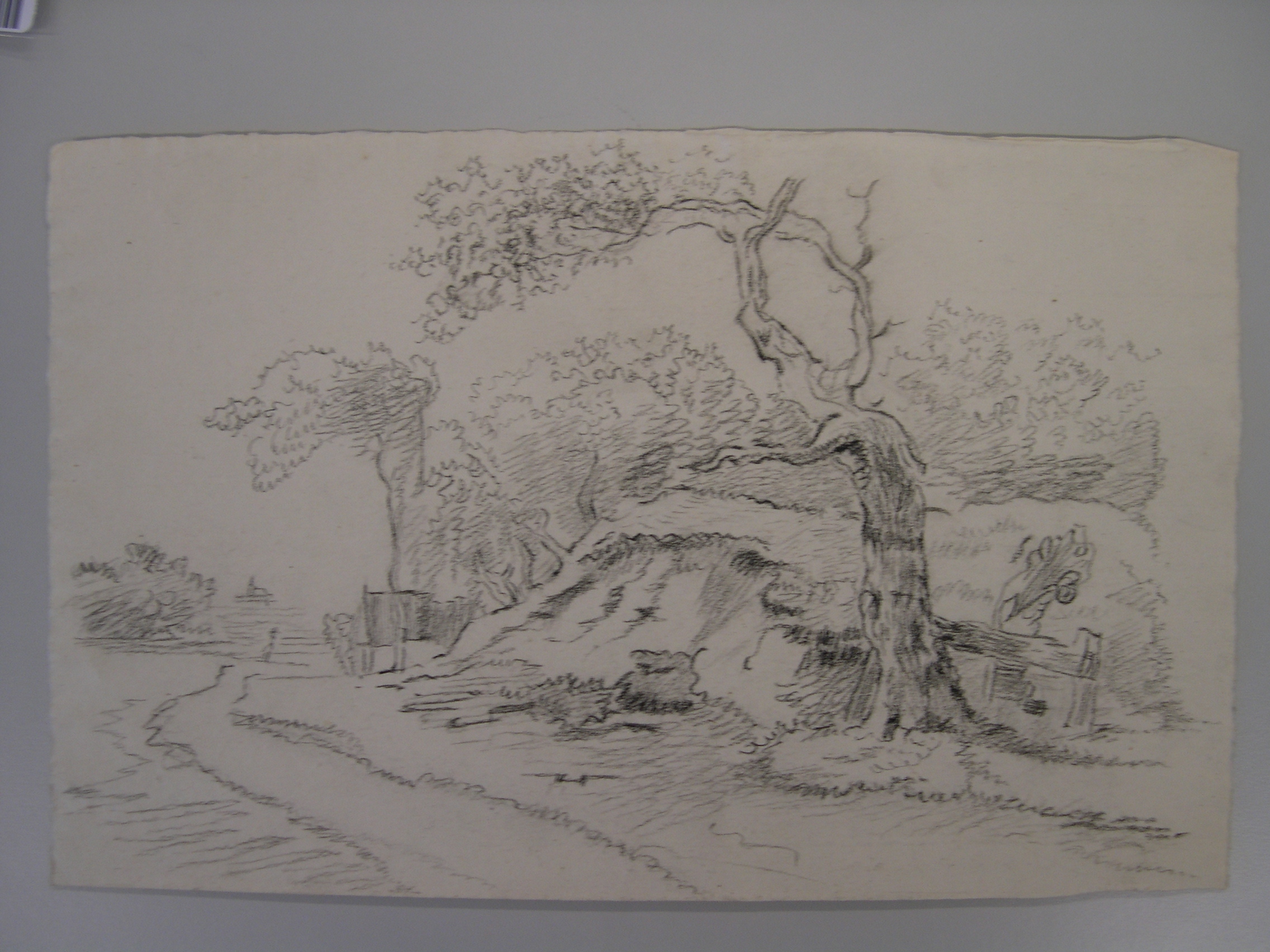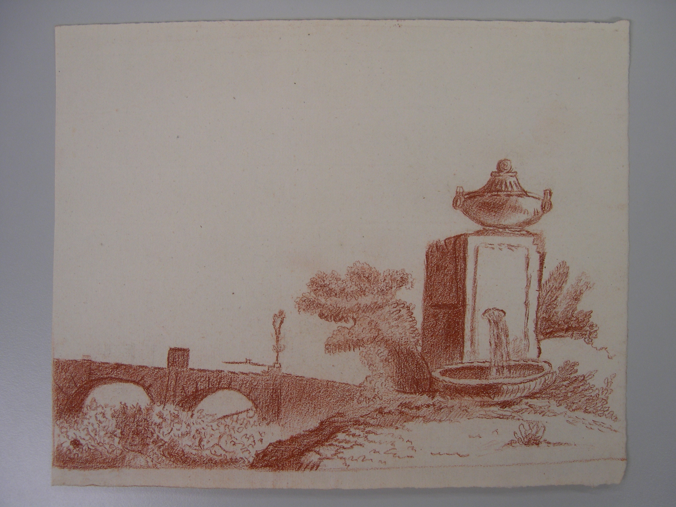 Schets van een landschap met brug en fontein