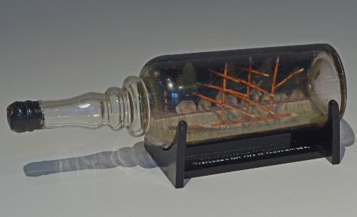 Scheepsmodel in fles op houten standaard