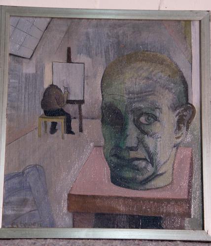Atelier met kop op de voorgrond, op de achtergrond e...