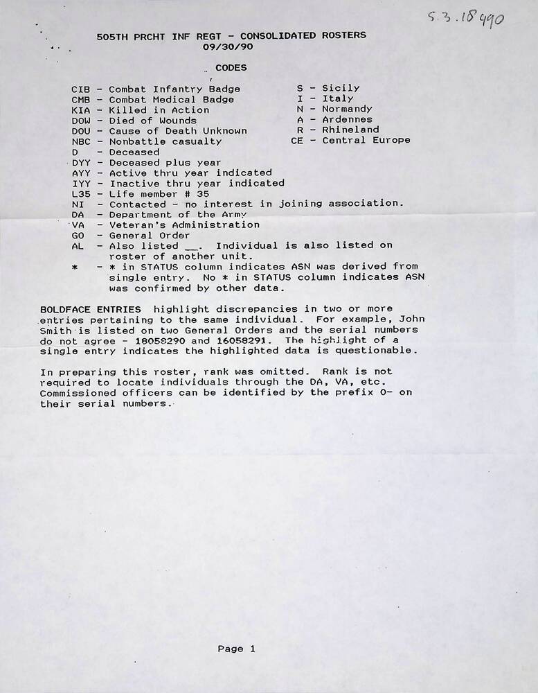 Co. A, 505th Prcht Inf Regt WW II roster 08-15-91