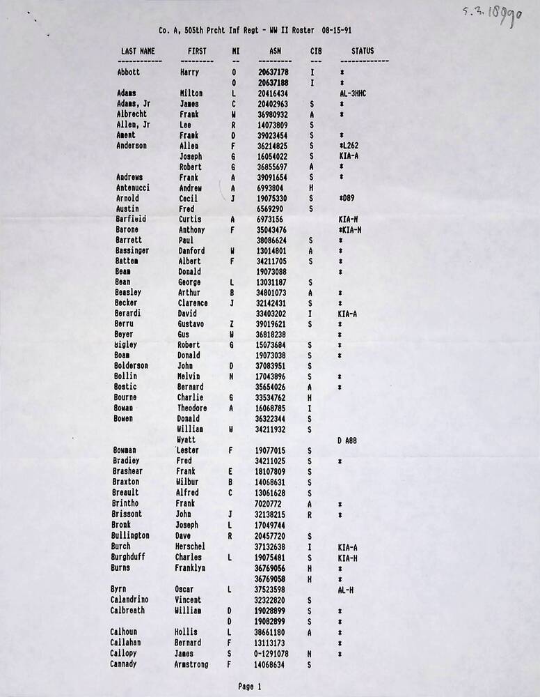 Co. A, 505th Prcht Inf Regt WW II roster 08-15-91