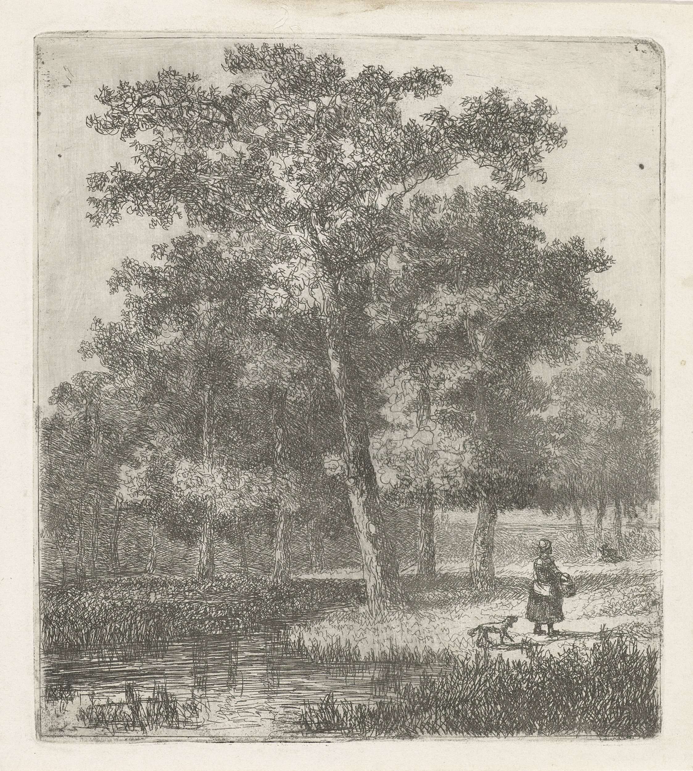 Bosgezicht met een vrouw en een hond bij een meertje