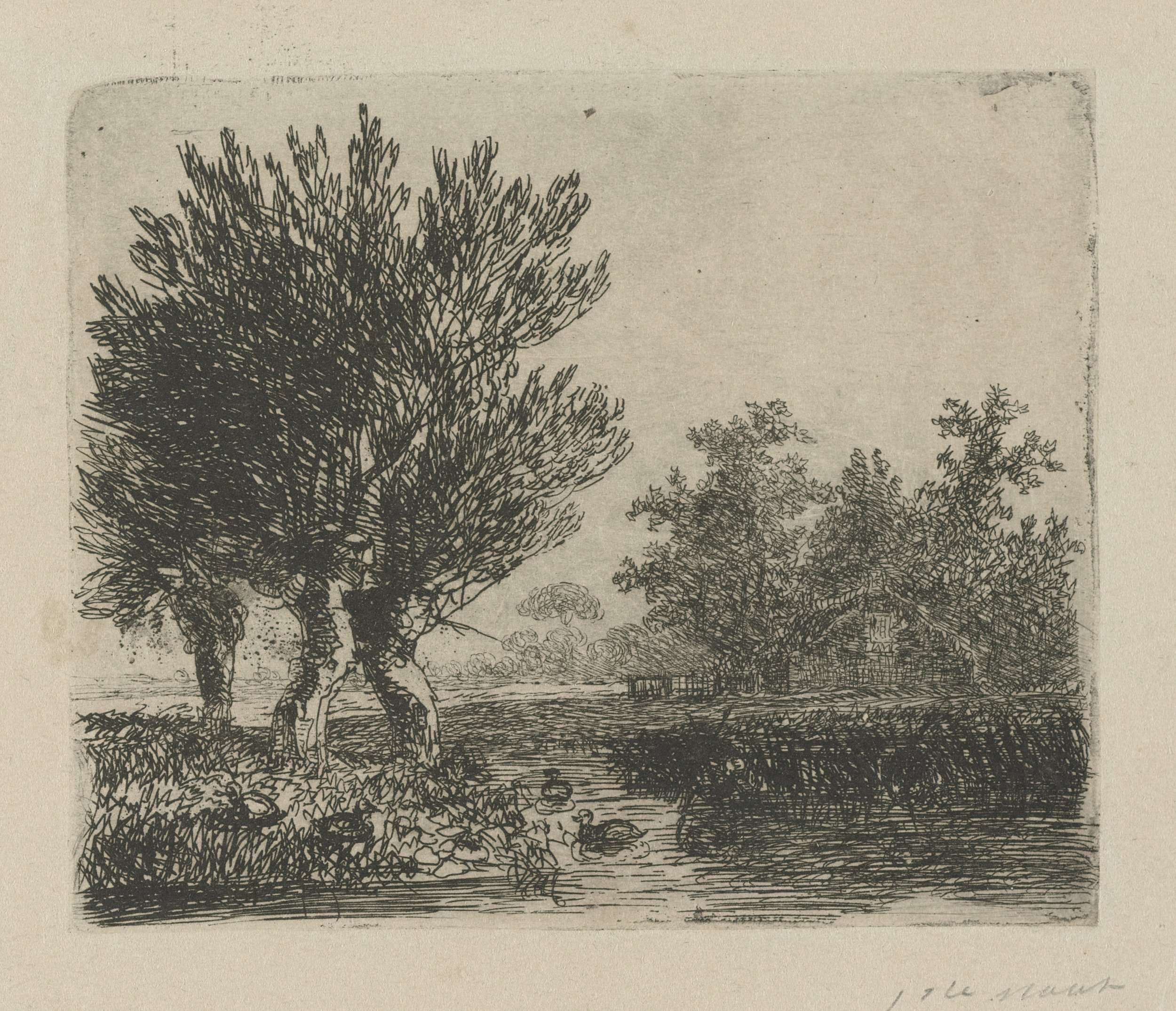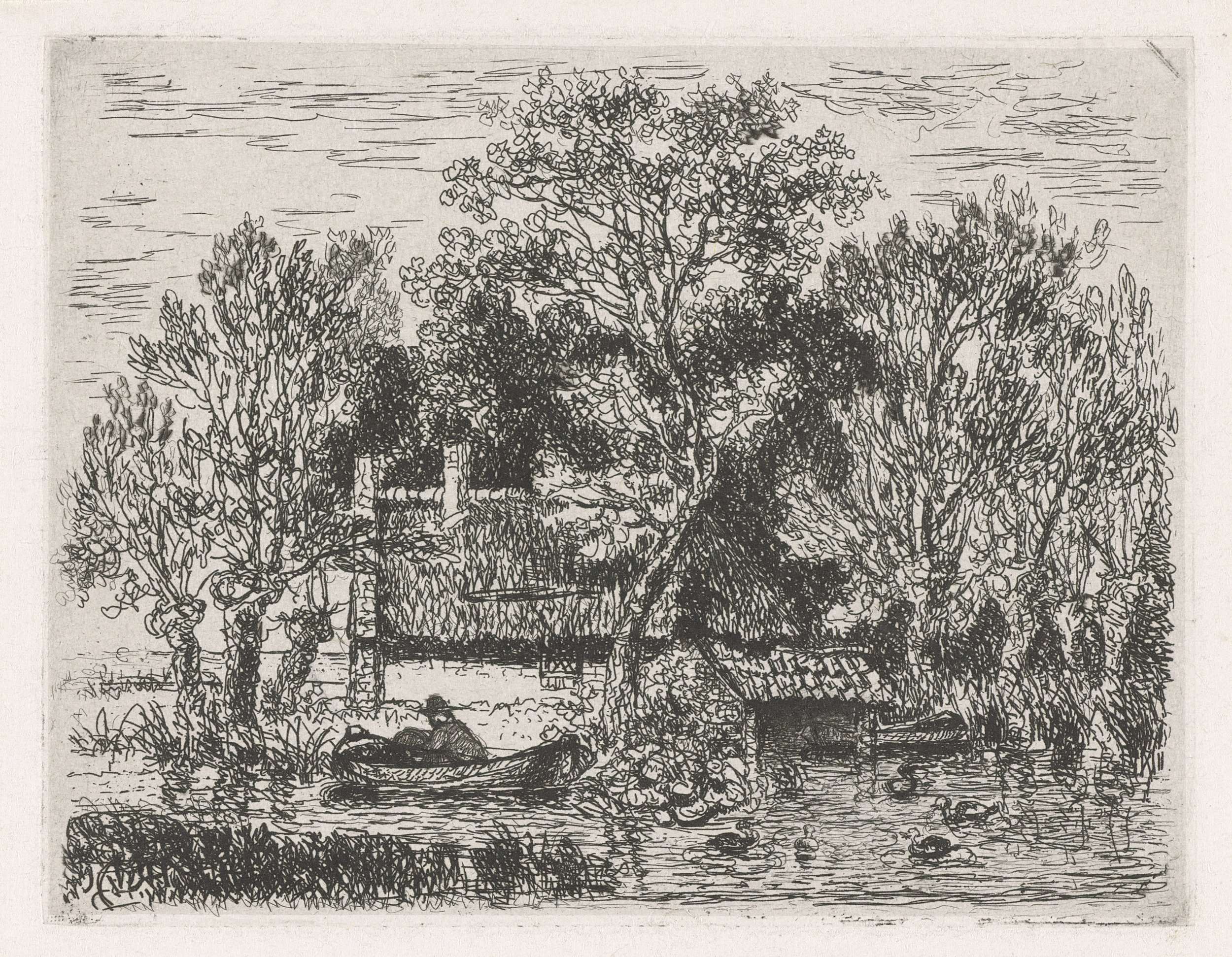 Riviergezicht met een schuit en eenden