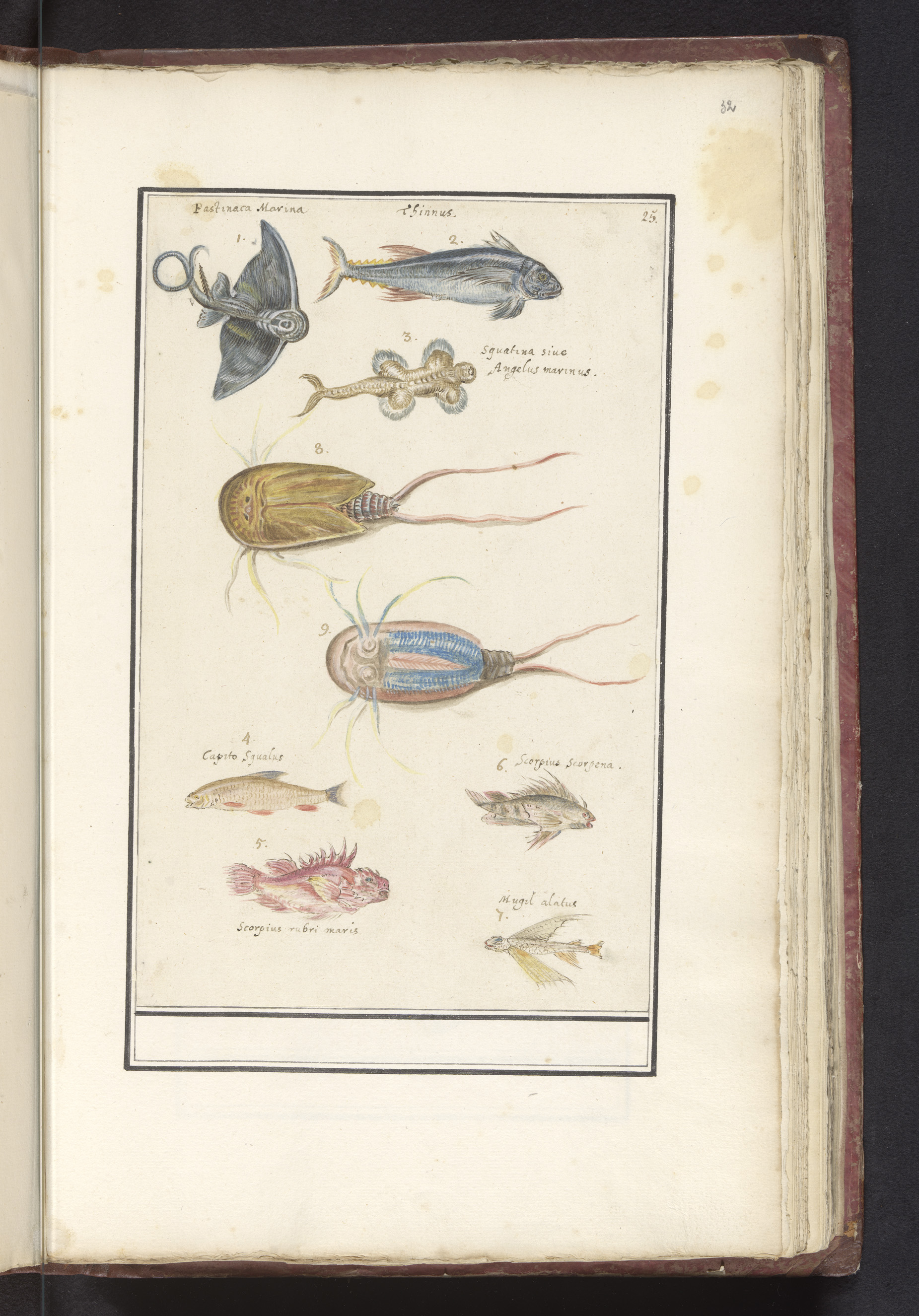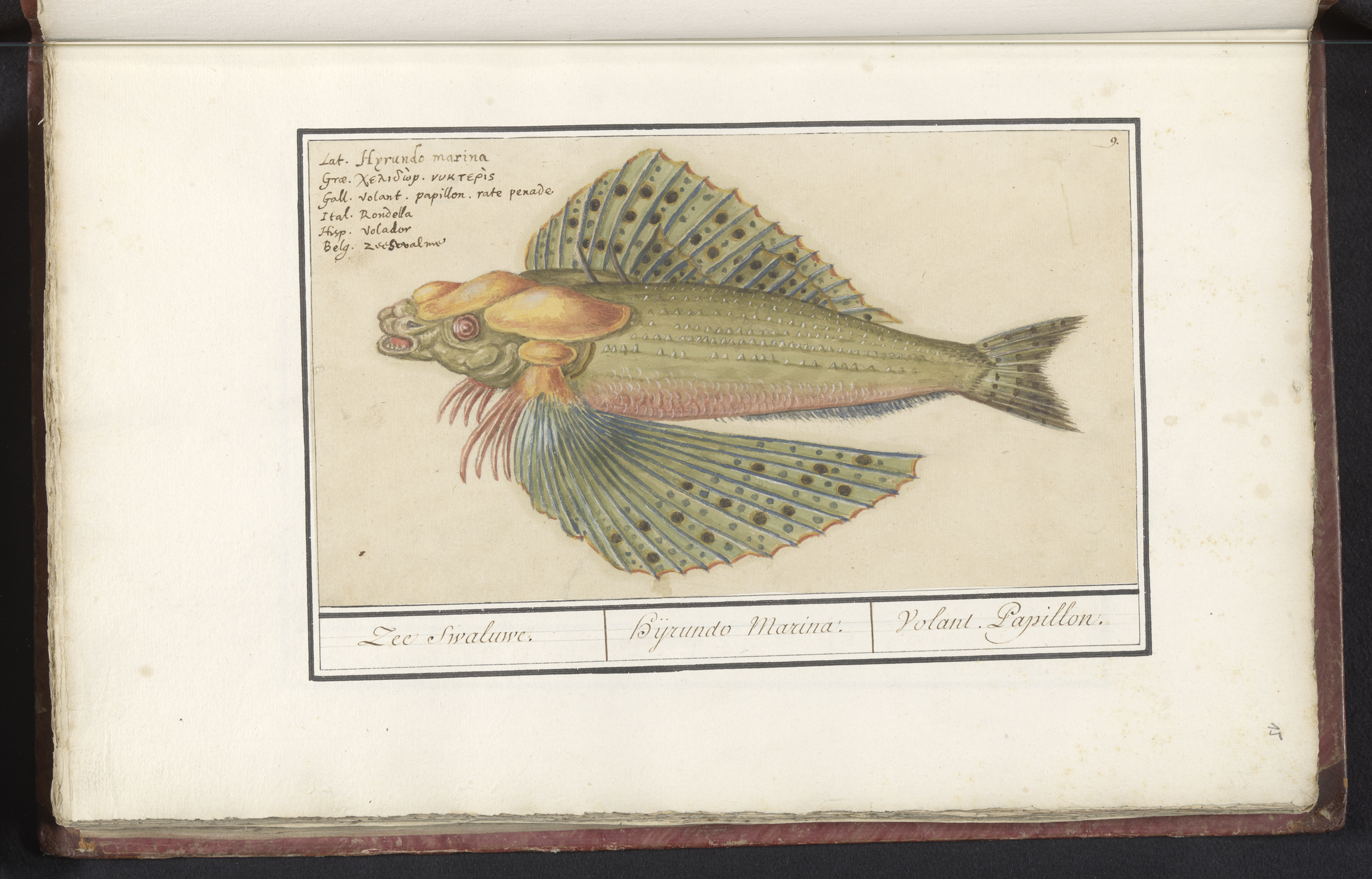 Blad met zeven verschillende vissen en een degenkrab