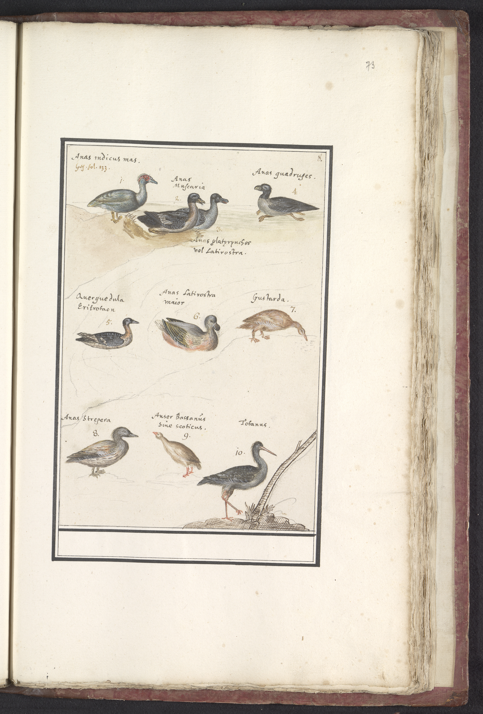 Blad met tien eenden (Anas) en andere watervogels